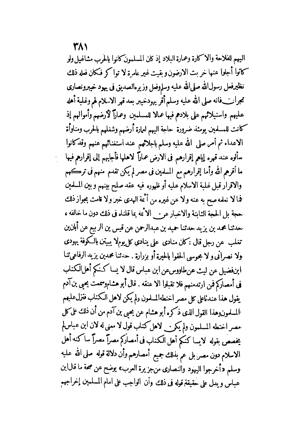 إلَيْهِمْ لِلْفِلَاحَةِ وَالْإِكَارَةِ وَعِمَارَةِ الْبِلَادِ إذْ كَانَ الْمُسْلِمُونَ كَانُوا بِالْحَرْبِ مَشَاغِيلَ وَلَوْ كَانُوا أَجْلَوْا عَنْهَا خَرِبَتْ الْأَرَضُونَ وَبَقِيَتْ غَيْرَ عَامِرَةٍ لَا تُوَاكَرُ فَكَانَ فِعْلُهُ ذَلِكَ نَظِيرَ فِعْلِ رَسُولِ اللَّهِ - صَلَّى اللَّهُ عَلَيْهِ وَسَلَّمَ - وَفِعْلِ وَزِيرِهِ الصِّدِّيقِ فِي يَهُودِ خَيْبَرَ وَنَصَارَى نَجْرَانَ فَإِنَّهُ - صَلَّى اللَّهُ عَلَيْهِ وَسَلَّمَ - أَقَرَّ يَهُودَ خَيْبَرَ بَعْدَ قَهْرِ الْإِسْلَامِ لَهُمْ وَغَلَبَةِ أَهْلِهِ عَلَيْهِمْ وَاسْتِيلَائِهِمْ عَلَى بِلَادِهِمْ فِيهَا عُمَّالًا لِلْمُسْلِمِينَ وَعُمَّارًا لِأَرْضِهِمْ وَأَمْوَالِهِمْ إذْ كَانَتْ لِلْمُسْلِمِينَ يَوْمَئِذٍ ضَرُورَةُ حَاجَةٍ إلَيْهِمْ لِعِمَارَةِ أَرْضِهِمْ وَشَغْلِهِمْ بِالْحَرْبِ وَمُنَاوَأَةِ الْأَعْدَاءِ ثُمَّ أَمَرَ - صَلَّى اللَّهُ عَلَيْهِ وَسَلَّمَ - بِإِجْلَائِهِمْ عِنْدَ اسْتِغْنَائِهِمْ عَنْهُمْ وَقَدْ كَانُوا سَأَلُوهُ عِنْدَ قَهْرِهِ إيَّاهُمْ إقْرَارَهُمْ فِي الْأَرْضِ عُمَّارًا لِأَهْلِهَا فَأَجَابَهُمْ إلَى إقْرَارِهِمْ فِيهَا مَا أَقَرَّهُمْ اللَّهُ، وَأَمَّا إقْرَارُهُمْ مَعَ الْمُسْلِمِينَ فِي مِصْرَ لَمْ يَكُنْ تَقَدَّمَ مِنْهُمْ فِي تَرْكِهِمْ وَالْإِقْرَارُ قَبْلَ غَلَبَةِ الْإِسْلَامِ عَلَيْهِ أَوْ ظُهُورِهِ فِيهِ عَقْدُ صُلْحٍ بَيْنَهُمْ وَبَيْنَ الْمُسْلِمِينَ فَمَا لَا نَعْلَمُهُ صَحَّ بِهِ عَنْهُ وَلَا عَنْ غَيْرِهِ مِنْ أَئِمَّةِ الْهُدَى خَبَرٌ وَلَا قَامَتْ بِجَوَازِ ذَلِكَ حُجَّةٌ بَلْ الْحُجَّةُ الثَّابِتَةُ وَالْأَخْبَارُ عَنْ الْأَئِمَّةِ بِمَا قُلْنَاهُ فِي ذَلِكَ دُونَ مَا خَالَفَهُ، حَدَّثَنَا مُحَمَّدُ بْنُ يَزِيدَ حَدَّثَنَا حُمَيْدُ بْنُ عَبْدِ الرَّحْمَنِ عَنْ قَيْسِ بْنِ الرَّبِيعِ عَنْ أَبَانَ بْنِ تَغْلِبَ عَنْ رَجُلٍ قَالَ: كَانَ مُنَادِي عَلِيٍّ يُنَادِي كُلَّ يَوْمٍ لَا يَبِيتَنَّ بِالْكُوفَةِ يَهُودِيٌّ وَلَا نَصْرَانِيٌّ وَلَا مَجُوسِيٌّ الْحَقُوا بِالْحِيرَةِ أَوْ بِزُرَارَةَ.