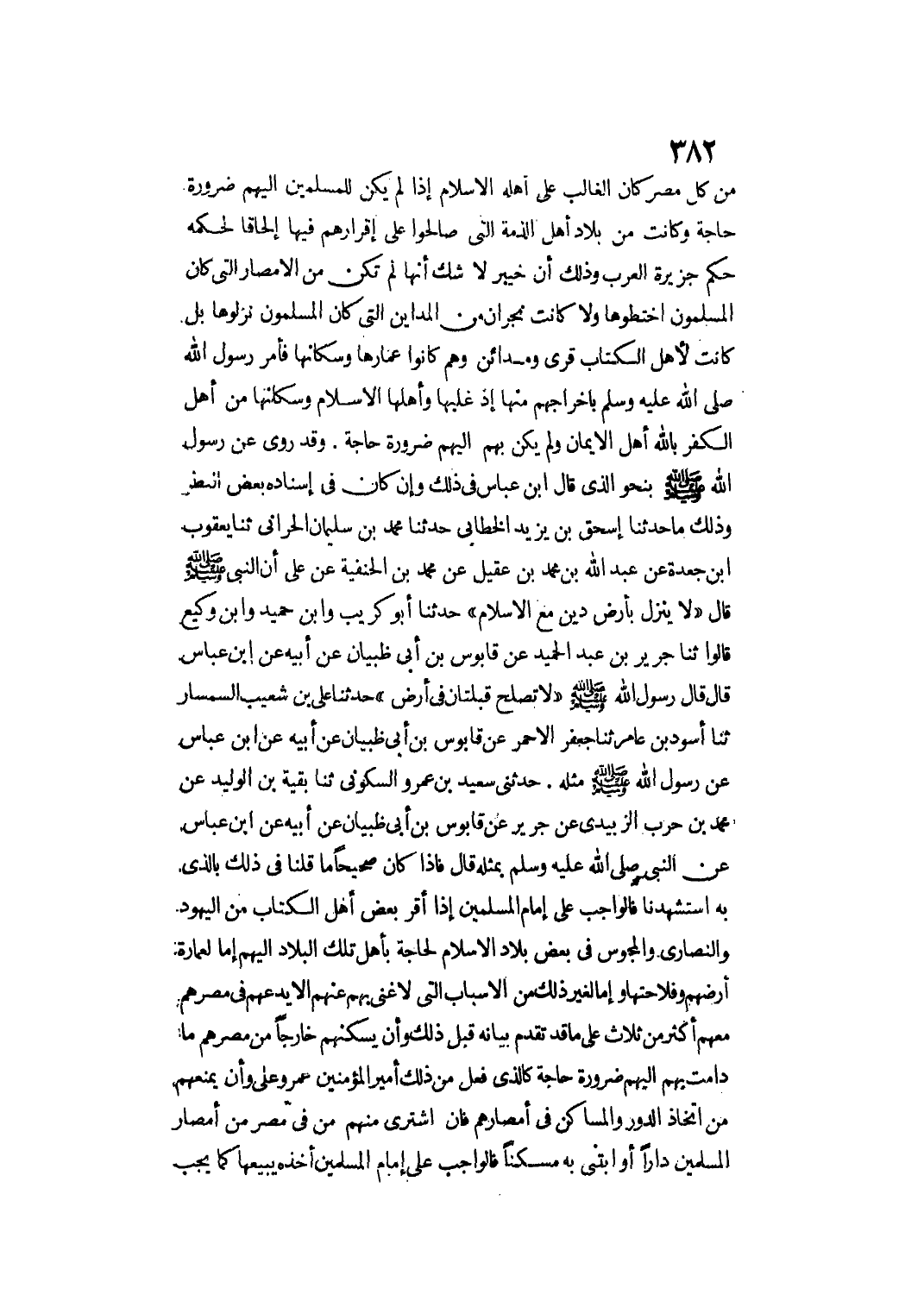 حَدَّثَنِي سَعِيدُ بْنُ عَمْرٍو السَّكُونِيُّ ثنا بَقِيَّةُ بْنُ الْوَلِيدِ عَنْ مُحَمَّدِ بْنِ حَرْبٍ الزُّبَيْدِيِّ عَنْ جَرِيرٍ عَنْ قَابُوسَ بْنِ أَبِي ظَبْيَانَ عَنْ أَبِيهِ عَنْ ابْنِ عَبَّاسٍ عَنْ النَّبِيِّ - صَلَّى اللَّهُ عَلَيْهِ وَسَلَّمَ - بِمِثْلِهِ قَالَ فَإِذَا كَانَ صَحِيحًا مَا قُلْنَا فِي ذَلِكَ بِاَلَّذِي بِهِ اسْتَشْهَدْنَا فَالْوَاجِبُ عَلَى إمَامِ الْمُسْلِمِينَ إذَا أَقَرَّ بَعْضَ أَهْلِ الْكِتَابِ مِنْ الْيَهُودِ وَالنَّصَارَى وَالْمَجُوسِ فِي بَعْضِ بِلَادِ الْإِسْلَامِ لِحَاجَةٍ بِأَهْلِ تِلْكَ الْبِلَادِ إلَيْهِمْ إمَّا لِعِمَارَةِ أَرْضِهِمْ وَفِلَاحَتِهَا وَإِمَّا لِغَيْرِ ذَلِكَ مِنْ الْأَسْبَابِ الَّتِي لَا غِنَى بِهِمْ عَنْهُمْ أَلَّا يَدَعَهُمْ فِي مِصْرِهِمْ مَعَهُمْ أَكْثَرُ مِنْ ثَلَاثٍ عَلَى مَا قَدْ تَقَدَّمَ بَيَانُهُ قَبْلَ ذَلِكَ وَأَنْ يُسْكِنَهُمْ خَارِجًا مِنْ مِصْرِهِمْ مَا دَامَتْ بِهِمْ إلَيْهِمْ ضَرُورَةُ حَاجَةٍ كَاَلَّذِي فَعَلَ مِنْ ذَلِكَ أَمِيرُ الْمُؤْمِنِينَ عُمَرَ وَعَلِيٌّ وَأَنْ يَمْنَعَهُمْ مِنْ اتِّخَاذِ الدُّورِ وَالْمَسَاكِنِ فِي أَمْصَارِهِمْ فَإِنْ اشْتَرَى مِنْهُمْ مَنْ فِي مِصْرٍ مِنْ أَمْصَارِ الْمُسْلِمِينَ دَارًا أَوْ ابْتَنَى بِهِ مَسْكَنًا فَالْوَاجِبُ عَلَى إمَامِ الْمُسْلِمِينَ أَخْذُهُ يَبِيعُهَا كَمَا يَجِبُ
