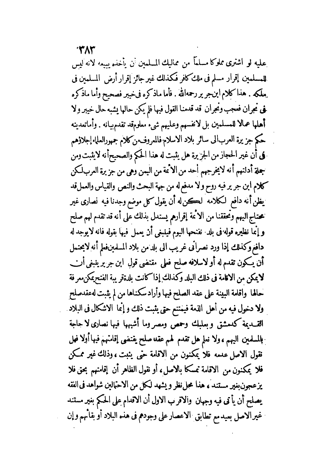 وَأَمَّا تَعْدِيَتُهُ حُكْمَ جَزِيرَةِ الْعَرَبِ إلَى سَائِرِ بِلَادِ الْإِسْلَامِ فَالْمَعْرُوفُ مِنْ كَلَامِ جُمْهُورِ الْعُلَمَاءِ إجْلَاؤُهُمْ فِي أَنَّ غَيْرَ الْحِجَازِ مِنْ الْجَزِيرَةِ هَلْ يَثْبُتُ لَهُ هَذَا الْحُكْمُ وَالصَّحِيحُ أَنَّهُ لَا يَثْبُتُ وَمِنْ جُمْلَةِ أَدِلَّتِهِمْ أَنَّهُ لَا يُخْرِجُهُمْ أَحَدٌ مِنْ الْأَئِمَّةِ مِنْ الْيَمَنِ وَهِيَ مِنْ جَزِيرَةِ الْعَرَبِ لَكِنَّ كَلَامَ ابْنِ جَرِيرٍ فِيهِ رُوحٌ وَلَا مَدْفَعَ لَهُ مِنْ جِهَةِ الْبَحْثِ وَالنَّصِّ وَالْقِيَاسُ وَالْعَمَلُ قَدْ يَظُنُّ أَنَّهُ دَافِعٌ لِكَلَامِهِ لَكِنْ لَهُ أَنْ يَقُولَ: كُلُّ مَوْضِعٍ وَجَدْنَا فِيهِ نَصَارَى غَيْرَ مُحْتَاجٍ إلَيْهِمْ وَتَحَقَّقْنَا مِنْ الْأَئِمَّةِ إقْرَارَهُمْ يُسْتَدَلُّ بِذَلِكَ عَلَى أَنَّهُ قَدْ تَقَدَّمَ لَهُمْ صُلْحٌ وَإِنَّمَا نَظِيرُهُ قَوْلُهُ فِي بَلَدٍ نَفْتَحُهَا الْيَوْمَ فَيَنْبَغِي أَنْ يَعْمَلَ فِيهَا بِقَوْلِهِ فَإِنَّهُ لَا يُوجَدُ لَهُ دَافِعٌ كَذَلِكَ إذَا وَرَدَ نَصْرَانِيٌّ غَرِيبٌ إلَى بَلَدٍ مِنْ بِلَادِ الْمُسْلِمِينَ فَعُلِمَ أَنَّهُ لَا يَحْتَمِلُ أَنْ يَكُونَ تَقَدَّمَ لَهُ أَوْ لِأَسْلَافِهِ صُلْحٌ فَعَلَى مُقْتَضَى قَوْلِ ابْنِ جَرِيرٍ يَنْبَغِي أَنْ لَا يُمَكَّنَ مِنْ الْإِقَامَةِ فِي ذَلِكَ الْبَلَدِ كَذَلِكَ إذَا كَانَتْ بَلْدَةٌ قَرِيبَةُ الْفَتْحِ يُمْكِنُ مَعْرِفَةُ حَالِهَا وَإِقَامَةُ الْبَيِّنَةِ عَلَى عَقْدِ الصُّلْحِ فِيهَا وَأَرَادَ سُكْنَاهَا مَنْ لَمْ يَثْبُتْ لَهُ عَقْدُ صُلْحٍ وَلَا دُخُولَ فِيهِ مِنْ أَهْلِ الذِّمَّةِ فَيَمْتَنِعُ حَتَّى يُثْبِتَ ذَلِكَ وَإِنَّمَا الْإِشْكَالُ فِي الْبِلَادِ الْقَدِيمَةِ كَدِمَشْقَ وَبَعْلَبَكّ وَحِمْصَ وَمِصْرَ وَمَا أَشْبَهَهَا فِيهَا نَصَارَى لَا حَاجَةَ بِالْمُسْلِمِينَ إلَيْهِمْ.