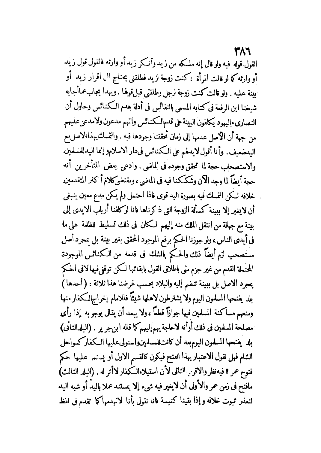 وَأَنَا أَقُولُ لَا يَدَ لَهُمْ عَلَى الْكَنَائِسِ فِي دَارِ الْإِسْلَامِ وَإِنَّمَا الْيَدُ لِلْمُسْلِمِينَ وَالِاسْتِصْحَابُ حُجَّةٌ لِمَا تَحَقَّقَ وُجُودُهُ فِي الْمَاضِي. وَادَّعَى بَعْضُ الْمُتَأَخِّرِينَ أَنَّهُ حُجَّةٌ أَيْضًا لِمَا وُجِدَ الْآنَ وَشَكَكْنَا فِيهِ فِي الْمَاضِي، وَمُقْتَضَى كَلَامِ أَكْثَرِ الْمُتَقَدِّمِينَ خِلَافُهُ لَكِنَّ التَّمَسُّكَ فِيهِ بِصُورَةِ الْيَدِ قَوِيٌّ فَإِذَا اُحْتُمِلَ وَلَمْ يَكُنْ مُدَّعٍ مُعَيَّنٌ يَنْبَغِي أَنْ لَا يُغَيَّرَ إلَّا بِبَيِّنَةٍ كَمَسْأَلَةِ الزَّوْجَةِ الَّتِي ذَكَرْنَاهَا فَإِنَّا لَوْ كَلَّفْنَا أَرْبَابَ الْأَيْدِي إلَى بَيِّنَةٍ مَعَ جَهَالَةِ مَنْ انْتَقَلَ الْمِلْكُ مِنْهُ إلَيْهِمْ لَكَانَ فِي ذَلِكَ تَسْلِيطٌ لِلظَّلَمَةِ عَلَى مَا فِي أَيْدِي النَّاسِ، وَلَوْ جَوَّزْنَا الْحُكْمَ بِرَفْعِ الْمَوْجُودِ الْمُحَقَّقِ بِغَيْرِ بَيِّنَةٍ بَلْ بِمُجَرَّدِ أَصْلٍ مُسْتَصْحَبٍ لَزِمَ أَيْضًا ذَلِكَ، وَالْحُكْمُ بِالشَّكِّ فِي قِدَمِهِ مِنْ الْكَنَائِسِ الْمَوْجُودَةِ الْمُحْتَمِلَةِ الْقِدَمِ مِنْ غَيْرِ جَزْمٍ مِنِّي بِإِطْلَاقِ الْقَوْلِ بِإِبْقَائِهَا لَكِنَّ تَوَقُّفِي فِيهَا لَا فِي الْحُكْمِ بِمُجَرَّدِ الْأَصْلِ بَلْ بِبَيِّنَةٍ تَنْضَمُّ إلَيْهِ وَالْبِلَادُ بِحَسَبِ غَرَضِنَا هَذَا ثَلَاثَةٌ: