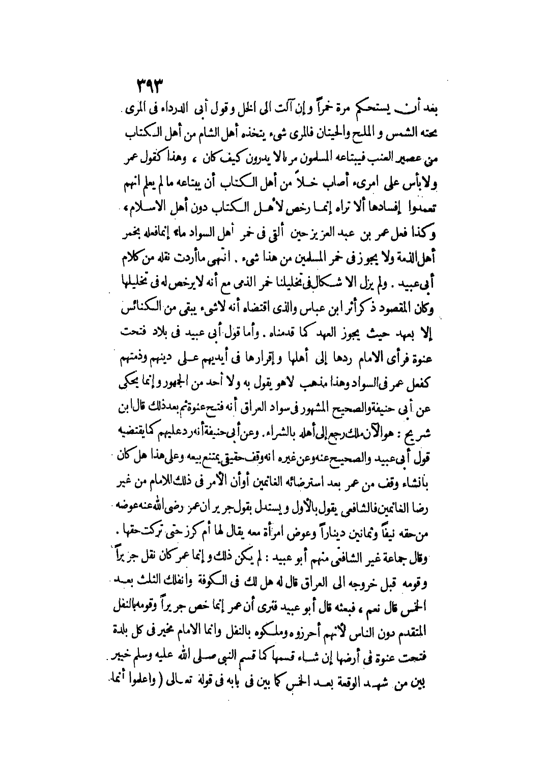 كَذَا فَعَلَ عُمَرُ بْنُ عَبْدِ الْعَزِيزِ حِينَ أَلْقَى فِي خَمْرِ أَهْلِ السَّوَادِ مَاءً أَمَّا فِعْلُهُ بِخَمْرِ أَهْلِ الذِّمَّةِ وَلَا يَجُوزُ فِي خَمْرِ الْمُسْلِمِينَ مِنْ هَذَا شَيْءٌ. انْتَهَى مَا أَرَدْت نَقْلَهُ مِنْ كَلَامِ أَبِي عُبَيْدٍ. وَلَمْ يَزَلْ الْإِشْكَالُ فِي تَخْلِيلِنَا خَمْرِ الذِّمِّيِّ مَعَ أَنَّهُ لَا يُرَخِّصُ لَهُ فِي تَخْلِيلِهَا وَكَانَ الْمَقْصُودُ ذِكْرَ أَثَرِ ابْنِ عَبَّاسٍ وَاَلَّذِي اقْتَضَاهُ أَنَّهُ لَا شَيْءَ يَبْقَى مِنْ الْكَنَائِسِ إلَّا بِعَهْدٍ حَيْثُ يَجُوزُ الْعَهْدُ كَمَا قَدَّمْنَاهُ. وَأَمَّا قَوْلُ أَبِي عُبَيْدٍ فِي بِلَادٍ فُتِحَتْ عَنْوَةً فَرَأَى الْإِمَامُ رَدَّهَا إلَى أَهْلِهَا وَإِقْرَارَهَا فِي أَيْدِيهِمْ عَلَى دِينِهِمْ وَذِمَّتِهِمْ كَفِعْلِ عُمَرَ فِي السَّوَادِ وَهَذَا مَذْهَبٌ لَا هُوَ يَقُولُ بِهِ وَلَا أَحَدٌ مِنْ الْجُمْهُورِ، وَإِنَّمَا يُحْكَى عَنْ أَبِي حَنِيفَةَ وَالصَّحِيحُ الْمَشْهُورُ فِي سَوَادِ الْعِرَاقِ أَنَّهُ فُتِحَ عَنْوَةً ثُمَّ بَعْدَ ذَلِكَ قَالَ ابْنُ شُرَيْحٍ: هُوَ الْآنَ مِلْكٌ رَجَعَ إلَى أَهْلِهِ بِالشِّرَاءِ.