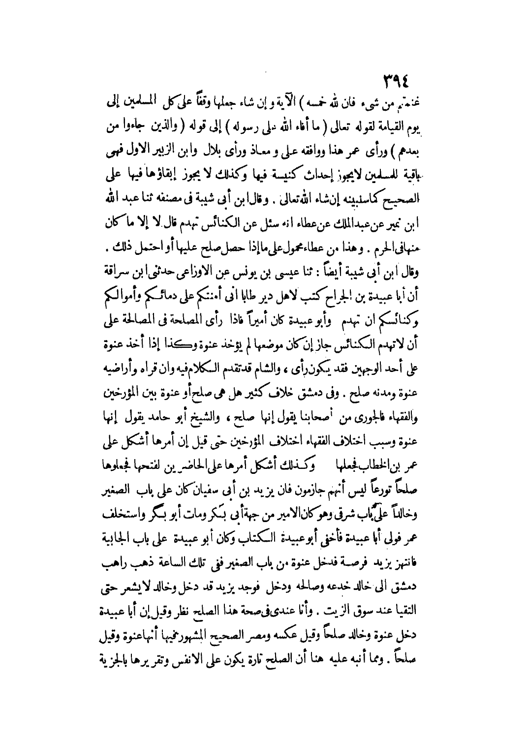 وَقَالَ ابْنُ أَبِي شَيْبَةَ أَيْضًا: ثنا عِيسَى بْنُ يُونُسَ عَنْ الْأَوْزَاعِيِّ حَدَّثَنِي ابْنُ سُرَاقَةَ أَنَّ أَبَا عُبَيْدَةَ بْنَ الْجَرَّاحِ كَتَبَ لِأَهْلِ دَيْرِ طَابَا أَنِّي أَمَّنْتُكُمْ عَلَى دِمَائِكُمْ وَأَمْوَالِكُمْ وَكَنَائِسِكُمْ أَنْ تُهْدَمَ وَأَبُو عُبَيْدَةَ كَانَ أَمِيرًا فَإِذَا رَأَى
