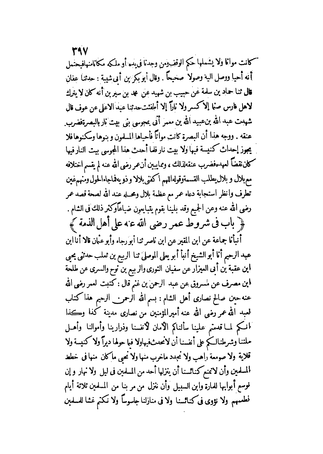 (بَابٌ فِي شُرُوطِ عُمَرَ - رَضِيَ اللَّهُ عَنْهُ - عَلَى أَهْلِ الذِّمَّةِ)