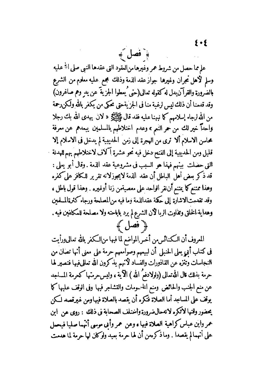 (فَصْلٌ) الْمَعْرُوفُ أَنَّ الْكَنَائِسَ مِنْ أَخَسِّ الْمَوَاضِعِ لِمَا فِيهَا مِنْ الْكُفْرِ بِاَللَّهِ تَعَالَى وَرَأَيْت فِي كِتَابِ أَبِي يَعْلَى الْحَنْبَلِيِّ أَنَّ لِبِيَعِهِمْ وَصَوَامِعِهِمْ حُرْمَةً عَلَى مَعْنَى أَنَّهَا تُصَانُ مِنْ النَّجَاسَاتِ وَتُنَزَّهُ عَنْ الْقَاذُورَاتِ وَالْفَسَادِ لِأَنَّهُمْ يَذْكُرُونَ اللَّهَ تَعَالَى فِيهَا فَتَصِيرُ لَهَا حُرْمَةٌ بِذَلِكَ قَالَ اللَّهُ تَعَالَى {وَلَوْلا دَفْعُ اللَّهِ} [الحج: 40] الْآيَةَ، وَلَيْسَ حُرْمَتُهَا كَحُرْمَةِ الْمَسَاجِدِ عَنْ مَنْعِ الْجُنُبِ وَالْحَائِضِ وَمَنْعِ الْخُصُومَاتِ وَالتَّشَاجُرِ فِيهَا وَفِي الْوَقْفِ عَلَيْهَا كَمَا يُوقَفُ عَلَى الْمَسَاجِدِ أَمَّا الصَّلَاةُ فَتُكْرَهُ أَنْ يَقْصِدَ بِالصَّلَاةِ فِيهَا وَمِنْ غَيْرِ قَصْدٍ لَكِنْ بِحُضُورِ وَقْتِهَا لَا تُكْرَهُ لِأَنَّهُ حَالُ ضَرُورَةٍ وَاخْتَلَفَ الصَّحَابَةُ فِي ذَلِكَ ".