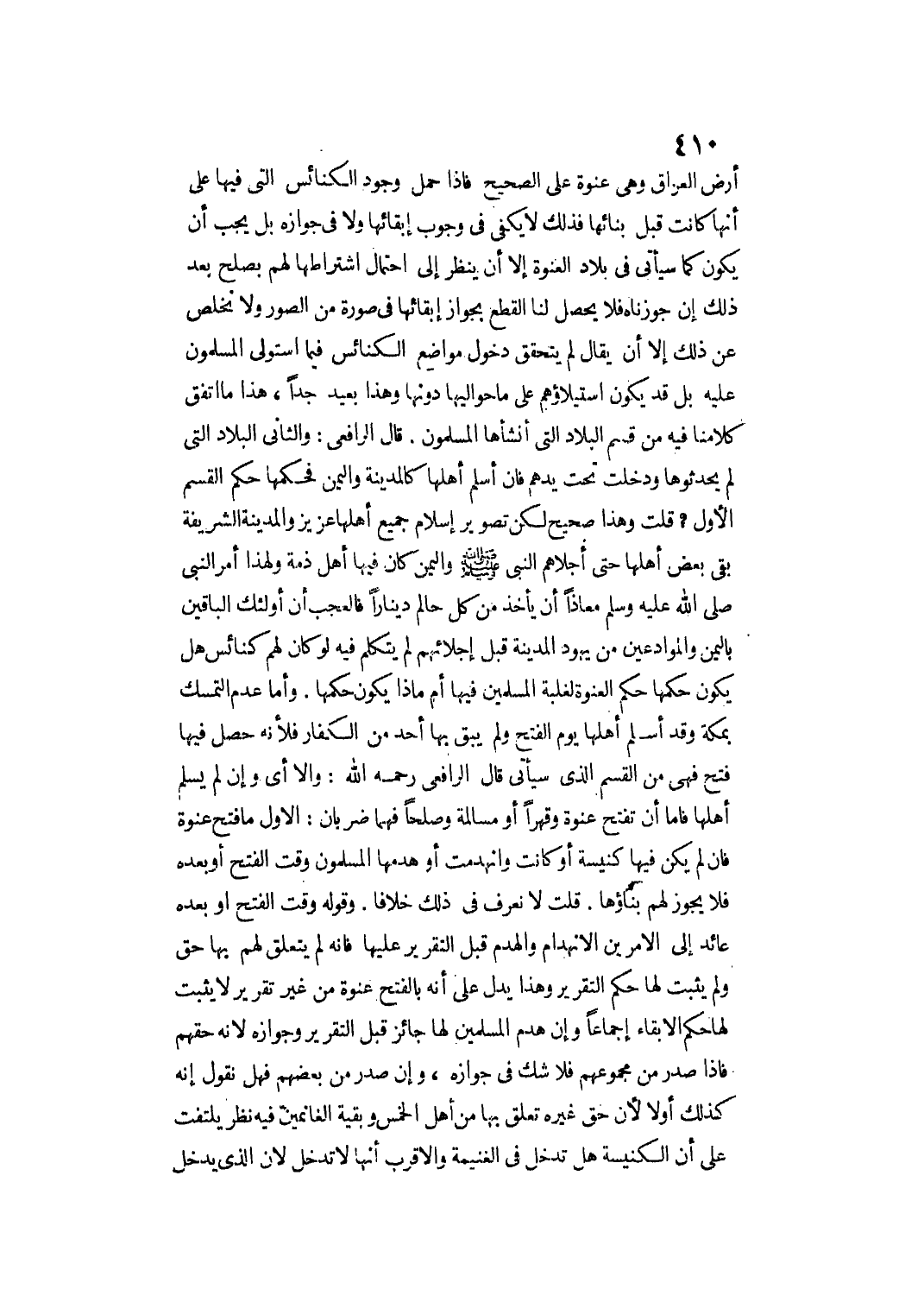 أَرْضِ الْعِرَاقِ وَهِيَ عَنْوَةٌ عَلَى الصَّحِيحِ فَإِذَا حُمِلَ وُجُودُ الْكَنَائِسِ الَّتِي فِيهَا عَلَى أَنَّهَا كَانَتْ قَبْلَ بِنَائِهَا فَذَاكَ لَا يَكْفِي فِي وُجُوبِ إبْقَائِهَا وَلَا فِي جَوَازِهِ بَلْ يَجِبُ أَنْ يَكُونَ كَمَا سَيَأْتِي فِي بِلَادِ الْعَنْوَةِ إلَّا أَنْ يَنْظُرَ إلَى احْتِمَالِ اشْتِرَاطِهَا لَهُمْ بِصُلْحٍ بَعْدَ ذَلِكَ إنْ جَوَّزْنَاهُ فَلَا يَحْصُلُ لَنَا الْقَطْعُ بِجَوَازِ إبْقَائِهَا فِي صُورَةٍ مِنْ الصُّوَرِ وَلَا نَخْلُصُ عَنْ ذَلِكَ إلَّا أَنْ يُقَالَ لَمْ يَتَحَقَّقْ دُخُولُ مَوَاضِعِ الْكَنَائِسِ فِيمَا اسْتَوْلَى الْمُسْلِمُونَ عَلَيْهِ بَلْ قَدْ يَكُونُ اسْتِيلَاؤُهُمْ عَلَى مَا حَوَالَيْهَا دُونَهَا وَهَذَا بَعِيدٌ جِدًّا.