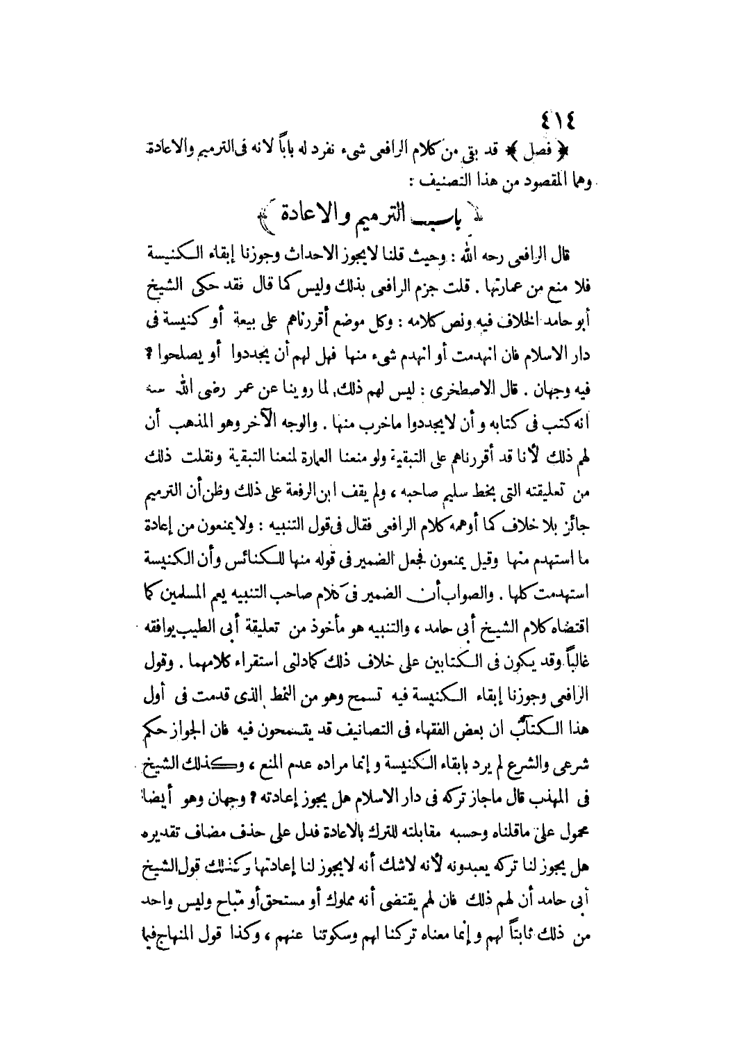 (فَصْلٌ) قَدْ بَقِيَ مِنْ كَلَامِ الرَّافِعِيِّ شَيْءٌ نُفْرِدُ لَهُ بَابًا لِأَنَّهُ فِي التَّرْمِيمِ وَالْإِعَادَةِ وَهُمَا الْمَقْصُودُ مِنْ هَذَا التَّصْنِيفِ: (بَابُ التَّرْمِيمِ وَالْإِعَادَةِ) قَالَ الرَّافِعِيُّ - رَحِمَهُ اللَّهُ -: وَحَيْثُ قُلْنَا لَا يَجُوزُ الْإِحْدَاثُ وَجَوَّزْنَا إبْقَاءَ الْكَنِيسَةِ فَلَا مَنْعَ مِنْ عِمَارَتِهَا. قُلْت جَزَمَ الرَّافِعِيُّ بِذَلِكَ وَلَيْسَ كَمَا قَالَ فَقَدْ حَكَى الشَّيْخُ أَبُو حَامِدٍ الْخِلَافَ فِيهِ، وَنَصُّ كَلَامِهِ: " وَكُلُّ مَوْضِعٍ أَقْرَرْنَاهُمْ عَلَى بِيعَةٍ أَوْ كَنِيسَةٍ فِي دَارِ الْإِسْلَامِ فَإِنْ انْهَدَمَتْ أَوْ انْهَدَمَ شَيْءٌ مِنْهَا فَهَلْ لَهُمْ أَنْ يُجَدِّدُوا أَوْ يُصْلِحُوا؟ فِيهِ وَجْهَانِ.