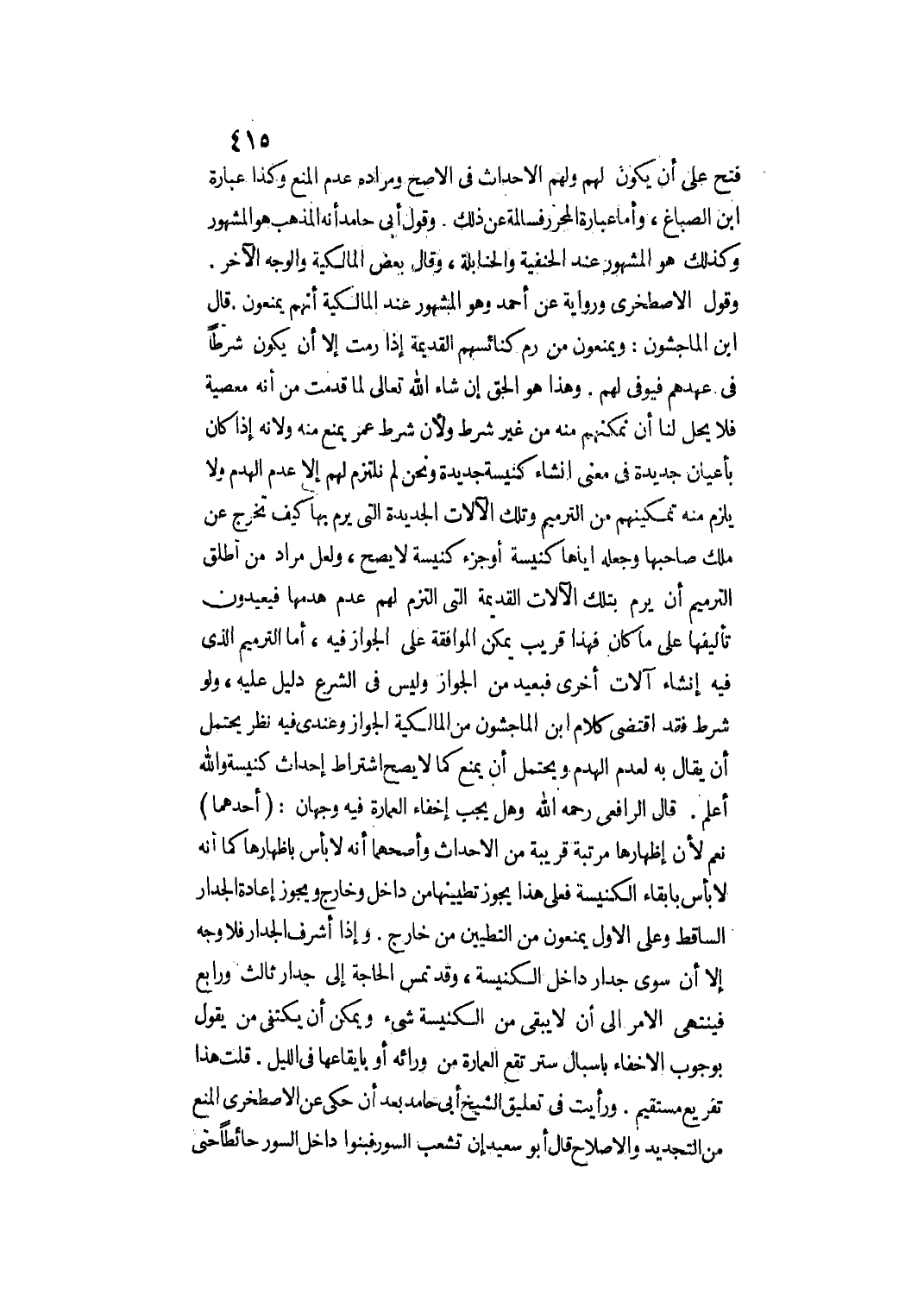 فُتِحَ عَلَى أَنْ يَكُونَ لَهُمْ وَلَهُمْ الْإِحْدَاثُ فِي الْأَصَحِّ وَمُرَادُهُ عَدَمُ الْمَنْعِ، وَكَذَا عِبَارَةُ ابْنِ الصَّبَّاغِ، وَأَمَّا عِبَارَةُ الْمُحَرَّرِ فَسَالِمَةٌ عَنْ ذَلِكَ وَقَوْلُ أَبِي حَامِدٍ أَنَّهُ الْمَذْهَبُ هُوَ الْمَشْهُورُ وَكَذَلِكَ هُوَ الْمَشْهُورُ عِنْدَ الْحَنَفِيَّةِ وَالْحَنَابِلَةِ. وَقَالَ بَعْضُ الْمَالِكِيَّةِ وَالْوَجْهُ الْآخَرُ.