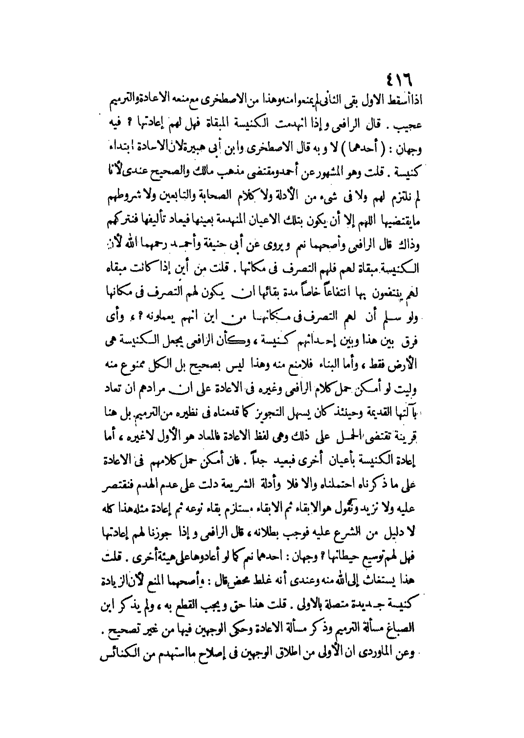 قُلْت مِنْ أَيْنَ إذَا كَانَتْ مُبْقَاةً لَهُمْ يَنْتَفِعُونَ بِهَا انْتِفَاعًا خَاصًّا مُدَّةَ بَقَائِهَا أَنْ يَكُونَ لَهُمْ التَّصَرُّفُ فِي مَكَانِهَا وَلَوْ سَلِمَ أَنَّ لَهُمْ التَّصَرُّفَ فِي مَكَانِهَا مِنْ أَيْنَ أَنَّهُمْ يَعْمَلُونَهُ؟ ، وَأَيُّ فَرْقٍ بَيْنَ هَذَا وَبَيْنَ إحْدَاثِهِمْ كَنِيسَةً، وَكَأَنَّ الرَّافِعِيَّ يَجْعَلُ الْكَنِيسَةَ هِيَ الْأَرْضُ فَقَطْ، وَأَمَّا الْبِنَاءُ فَلَا مَنْعَ مِنْهُ وَهَذَا لَيْسَ بِصَحِيحٍ بَلْ الْكُلُّ مَمْنُوعٌ مِنْهُ وَلَيْتَ لَوْ أَمْكَنَ حَمْلُ كَلَامِ الرَّافِعِيِّ وَغَيْرِهِ فِي الْإِعَادَةِ عَلَى أَنَّ مُرَادَهُمْ أَنْ تُعَادَ بِآلَتِهَا الْقَدِيمَةِ وَحِينَئِذٍ كَانَ يَسْهُلُ التَّجْوِيزُ كَمَا قَدَّمْنَاهُ فِي نَظِيرِهِ مِنْ التَّرْمِيمِ بَلْ هُنَا قَرِينَةٌ تَقْتَضِي الْحَمْلَ عَلَى ذَلِكَ وَهِيَ لَفْظُ الْإِعَادَةِ فَالْمُعَادُ هُوَ الْأَوَّلُ لَا غَيْرُهُ، أَمَّا إعَادَةُ الْكَنِيسَةِ بِأَعْيَانٍ أُخْرَى فَبَعِيدٌ جِدًّا. فَإِنْ أَمْكَنَ حَمْلُ كَلَامِهِمْ فِي الْإِعَادَةِ عَلَى مَا ذَكَرْنَاهُ احْتَمَلْنَاهُ، وَإِلَّا فَلَا وَأَدِلَّةُ الشَّرِيعَةِ دَلَّتْ عَلَى عَدَمِ الْهَدْمِ فَنَقْتَصِرُ عَلَيْهِ وَلَا نَزِيدُ وَنَقُولُ هُوَ الْإِبْقَاءُ ثُمَّ الْإِبْقَاءُ مُسْتَلْزِمُ بَقَاءَ نَوْعِهِ ثُمَّ إعَادَةُ مِثْلِهِ.