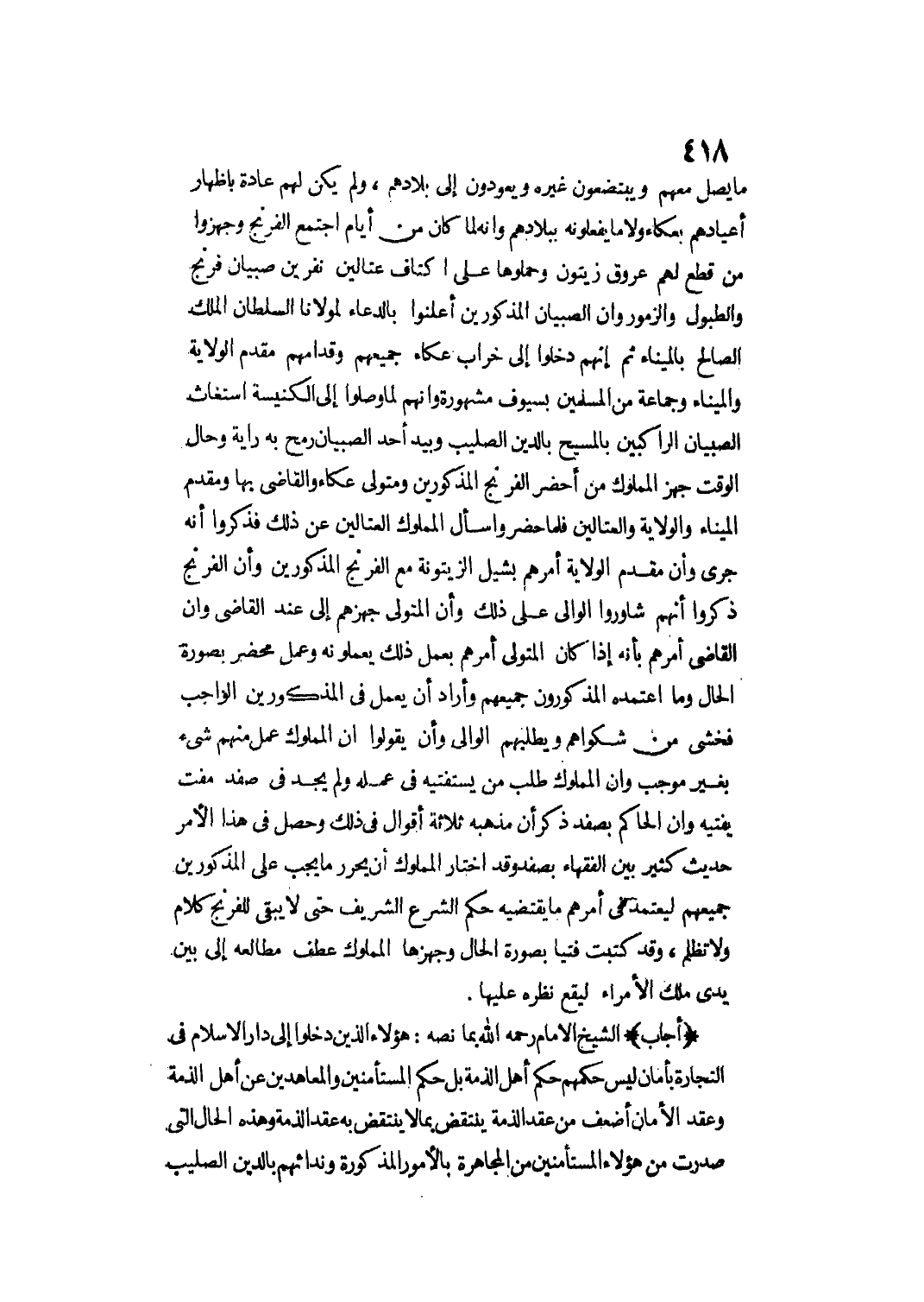 مَا يَصِلُ مَعَهُمْ وَيَبْتَضِعُونَ غَيْرَهُ وَيَعُودُونَ إلَى بِلَادِهِمْ، وَلَمْ يَكُنْ لَهُمْ عَادَةٌ بِإِظْهَارِ أَعْيَادِهِمْ بِعَكَّاءَ وَلَا مَا يَفْعَلُونَهُ بِبِلَادِهِمْ وَأَنَّهُ لَمَّا كَانَ مِنْ أَيَّامٍ اجْتَمَعَ الْفِرِنْجُ وَجَهَّزُوا مَنْ قَطَعَ لَهُمْ عُرُوقَ زَيْتُونٍ وَحَمَلُوهَا عَلَى أَكْتَافِ عَتَّالِينَ نَفَرَيْنِ صِبْيَانَ فِرِنْجَ وَالطُّبُولُ وَالزَّمُورُ وَأَنَّ الصِّبْيَانَ الْمَذْكُورِينَ أَعْلَنُوا بِالدُّعَاءِ لِمَوْلَانَا السُّلْطَانِ الْمَلِكِ الصَّالِحِ بِالْمِينَاءِ ثُمَّ إنَّهُمْ دَخَلُوا إلَى خَرَابِ عَكَّاءَ جَمِيعُهُمْ وَقُدَّامُهُمْ مُقَدَّمُ الْوِلَايَةِ وَالْمِينَاءُ وَجَمَاعَةٌ مِنْ الْمُسْلِمِينَ بِسُيُوفٍ مَشْهُورَةٍ وَأَنَّهُمْ لَمَّا وَصَلُوا إلَى الْكَنِيسَةِ اسْتَغَاثَ الصِّبْيَانُ الرَّاكِبِينَ بِالْمَسِيحِ بِالدِّينِ الصَّلِيبِ وَبِيَدِ أَحَدِ الصِّبْيَانِ رُمْحٌ بِهِ رَايَةٌ وَحَالَ الْوَقْتِ جَهَّزَ الْمَمْلُوكُ مَنْ أَحْضَرَ الْفِرِنْجَ الْمَذْكُورِينَ وَمُتَوَلِّيَ عَكَّاءَ وَالْقَاضِيَ بِهَا وَمُقَدَّمَ الْمِينَاءِ وَالْوِلَايَةِ وَالْعَتَّالِينَ فَلَمَّا حَضَرُوا سَأَلَ الْمَمْلُوكُ الْعَتَّالِينَ عَنْ ذَلِكَ فَذَكَرُوا أَنَّهُ جَرَى وَأَنَّ مُقَدَّمَ الْوِلَايَةِ أَمَرَهُمْ بِشَيْلِ الزَّيْتُونَةِ مَعَ الْفِرِنْجِ الْمَذْكُورِينَ وَأَنَّ الْفِرِنْجَ ذَكَرُوا أَنَّهُمْ شَاوَرُوا الْوَالِيَ عَلَى ذَلِكَ وَأَنَّ الْمُتَوَلِّيَ جَهَّزَهُمْ إلَى عِنْدِ الْقَاضِي وَأَنَّ الْقَاضِيَ أَمَرَهُمْ بِأَنَّهُ إذَا كَانَ الْمُتَوَلِّي أَمَرَهُمْ بِعَمَلِ ذَلِكَ يَعْمَلُونَهُ وَعُمِلَ مُحْضَرٌ بِصُورَةِ الْحَالِ وَمَا اعْتَمَدَهُ الْمَذْكُورُونَ جَمِيعُهُمْ وَأَرَادَ أَنْ يَعْمَلَ فِي الْمَذْكُورِينَ الْوَاجِبَ فَخَشِيَ مِنْ شَكْوَاهُمْ وَيَطْلُبهُمْ الْوَالِي وَأَنْ يَقُولُوا إنَّ الْمَمْلُوكَ عَمِلَ مِنْهُمْ شَيْئًا بِغَيْرِ مُوجِبٍ وَأَنَّ الْمَمْلُوكَ طَلَبَ مَنْ يَسْتَفْتِيهِ فِي عَمَلِهِ وَلَمْ يَجِدْ فِي صَفَدٍ مُفْتٍ يُفْتِيهِ وَأَنَّ الْحَاكِمَ بِصَفَدٍ ذَكَرَ أَنَّ مَذْهَبَهُ ثَلَاثَةُ أَقْوَالٍ فِي ذَلِكَ وَحَصَلَ فِي هَذَا الْأَمْرِ حَدِيثٌ كَثِيرٌ بَيْنَ الْفُقَهَاءِ بِصَفَدٍ وَقَدْ اخْتَارَ الْمَمْلُوكُ أَنْ يُحَرِّرَ مَا يَجِبُ عَلَى الْمَذْكُورِينَ جَمِيعِهِمْ لِيَعْتَمِدَ فِي أَمْرِهِمْ مَا يَقْتَضِيهِ حُكْمُ الشَّرْعِ الشَّرِيفِ حَتَّى لَا يَبْقَى لِلْفِرِنْجِ كَلَامٌ وَلَا تَظَلُّمٌ، وَقَدْ كَتَبْت فُتْيَا بِصُورَةِ الْحَالِ وَجَهَّزَهَا الْمَمْلُوكُ عَطَفَ مَطَالِعَهُ إلَى بَيْنِ يَدَيْ مَلِكِ الْأُمَرَاءِ لِيَقَعَ نَظَرُهُ عَلَيْهَا.