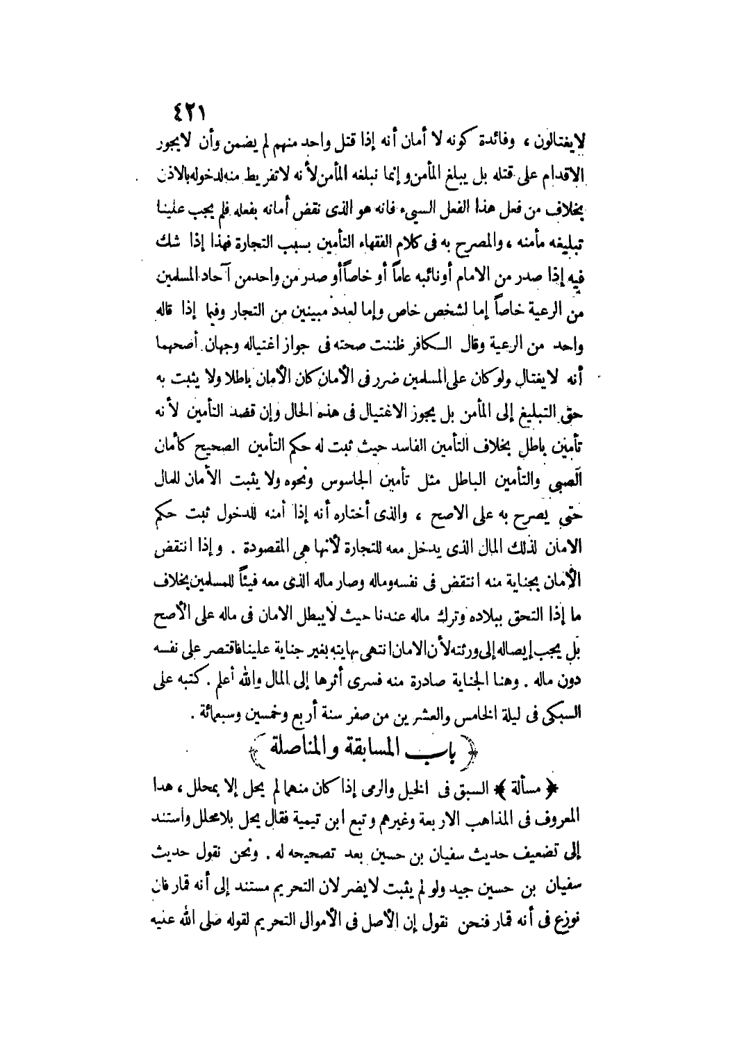 (بَابُ الْمُسَابَقَةِ وَالْمُنَاصَلَةِ) (مَسْأَلَةٌ) السَّبْقُ فِي الْخَيْلِ وَالرَّمْيِ إذَا كَانَ مِنْهُمَا لَمْ يَحِلَّ إلَّا بِمُحَلِّلٍ، هَذَا الْمَعْرُوفُ فِي الْمَذَاهِبِ الْأَرْبَعَةِ وَغَيْرِهِمْ وَتَبِعَ ابْنُ تَيْمِيَّةَ فَقَالَ يَحِلُّ بِلَا مُحَلِّلٍ وَاسْتَنَدَ إلَى تَضْعِيفِ حَدِيثِ سُفْيَانَ بْنِ حُسَيْنٍ بَعْدَ تَصْحِيحِهِ لَهُ. وَنَحْنُ نَقُولُ حَدِيثُ سُفْيَانَ بْنِ حُسَيْنٍ جَيِّدٌ وَلَوْ لَمْ يَثْبُتْ لَا يَضُرُّ لِأَنَّ التَّحْرِيمَ مُسْتَنِدٌ إلَى أَنَّهُ قِمَارٌ فَإِنْ نُوزِعَ فِي أَنَّهُ قِمَارٌ فَنَحْنُ نَقُولُ إنَّ الْأَصْلَ فِي الْأَمْوَالِ التَّحْرِيمُ لِقَوْلِهِ - صَلَّى اللَّهُ عَلَيْهِ وَسَلَّمَ -