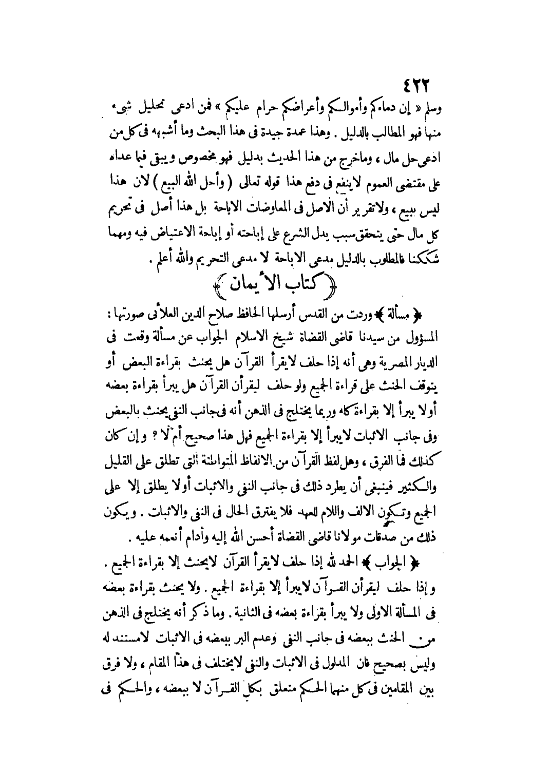 (كِتَابُ الْأَيْمَانِ) (مَسْأَلَةٌ) وَرَدَتْ مِنْ الْقُدْسِ أَرْسَلَهَا الْحَافِظُ صَلَاحُ الدِّينِ الْعَلَائِيُّ صُورَتُهَا: الْمَسْئُولُ مِنْ سَيِّدِنَا قَاضِي الْقُضَاةِ شَيْخِ الْإِسْلَامِ الْجَوَابُ عَنْ مَسْأَلَةٍ وَقَعَتْ فِي الدِّيَارِ الْمِصْرِيَّةِ وَهِيَ أَنَّهُ إذَا حَلَفَ لَا يَقْرَأُ الْقُرْآنَ هَلْ يَحْنَثُ بِقِرَاءَةِ الْبَعْضِ أَوْ يَتَوَقَّفُ الْحِنْثُ عَلَى قِرَاءَةِ الْجَمِيعِ وَلَوْ حَلَفَ لَيَقْرَأَنَّ الْقُرْآنَ هَلْ يَبْرَأُ بِقِرَاءَةِ بَعْضِهِ أَوْ لَا يَبْرَأُ إلَّا بِقِرَاءَةِ كُلِّهِ وَرُبَّمَا يَخْتَلِجُ فِي الذِّهْنِ أَنَّهُ فِي جَانِبِ النَّفْيِ يَحْنَثُ بِالْبَعْضِ وَفِي جَانِبِ الْإِثْبَاتِ لَا يَبْرَأُ إلَّا بِقِرَاءَةِ الْجَمِيعِ فَهَلْ هَذَا صَحِيحٌ أَمْ لَا؟ وَإِنْ كَانَ كَذَلِكَ فَمَا الْفَرْقُ، وَهَلْ لَفْظُ الْقُرْآنِ مِنْ الْأَلْفَاظِ الْمُتَوَاطِئَةِ الَّتِي تُطْلَقُ عَلَى الْقَلِيلِ وَالْكَثِيرِ فَيَنْبَغِي أَنْ يَطَّرِدَ ذَلِكَ فِي جَانِبِ النَّفْيِ وَالْإِثْبَاتِ أَوْ لَا يُطْلَقُ إلَّا عَلَى الْجَمِيعِ وَتَكُونُ الْأَلِفُ وَاللَّامُ لِلْعَهْدِ فَلَا يَفْتَرِقُ الْحَالُ فِي النَّفْيِ وَالْإِثْبَاتِ. وَيَكُونُ ذَلِكَ مِنْ صَدَقَاتِ مَوْلَانَا قَاضِي الْقُضَاةِ - أَحْسَنَ اللَّهُ - إلَيْهِ وَأَدَامَ أَنْعُمَهُ عَلَيْهِ.