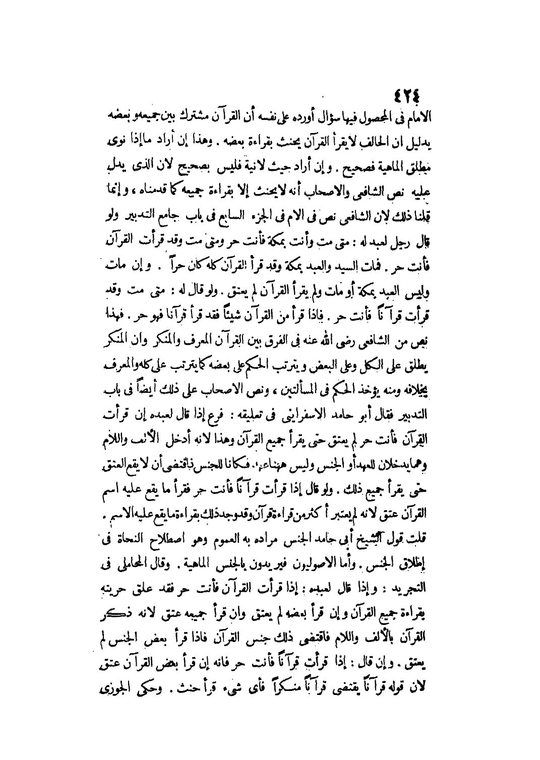 فَهَذَا نَصٌّ مِنْ الشَّافِعِيِّ - رَضِيَ اللَّهُ عَنْهُ - فِي الْفَرْقِ بَيْنَ الْقُرْآنِ الْمُعَرَّفِ وَالْمُنَكَّرِ وَأَنَّ الْمُنَكَّرَ يُطْلَقُ عَلَى الْكُلِّ وَعَلَى الْبَعْضِ وَيَتَرَتَّبُ الْحُكْمُ عَلَى بَعْضِهِ كَمَا يَتَرَتَّبُ عَلَى كُلِّهِ وَالْمُعَرَّفُ بِخِلَافِهِ وَمِنْهُ يُؤْخَذُ الْحُكْمُ فِي الْمَسْأَلَتَيْنِ، وَنَصَّ الْأَصْحَابُ عَلَى ذَلِكَ أَيْضًا فِي بَابِ التَّدْبِيرِ، فَقَالَ أَبُو حَامِدٍ الْإسْفَرايِينِيّ فِي تَعْلِيقِهِ: فَرْعٌ إذَا قَالَ لِعَبْدِهِ إنْ قَرَأْت الْقُرْآنَ فَأَنْتَ حُرٌّ لَمْ يُعْتَقْ حَتَّى يَقْرَأَ جَمِيعَ الْقُرْآنِ وَهَذَا لِأَنَّهُ أَدْخَلَ الْأَلِفَ وَاللَّامَ وَهُمَا يَدْخُلَانِ لِلْعَهْدِ أَوْ الْجِنْسِ وَلَيْسَ هَاهُنَا عَهْدٌ فَكَانَا لِلْجِنْسِ فَاقْتَضَى أَنْ لَا يَقَعَ الْعِتْقُ حَتَّى يَقْرَأَ جَمِيعَ ذَلِكَ.