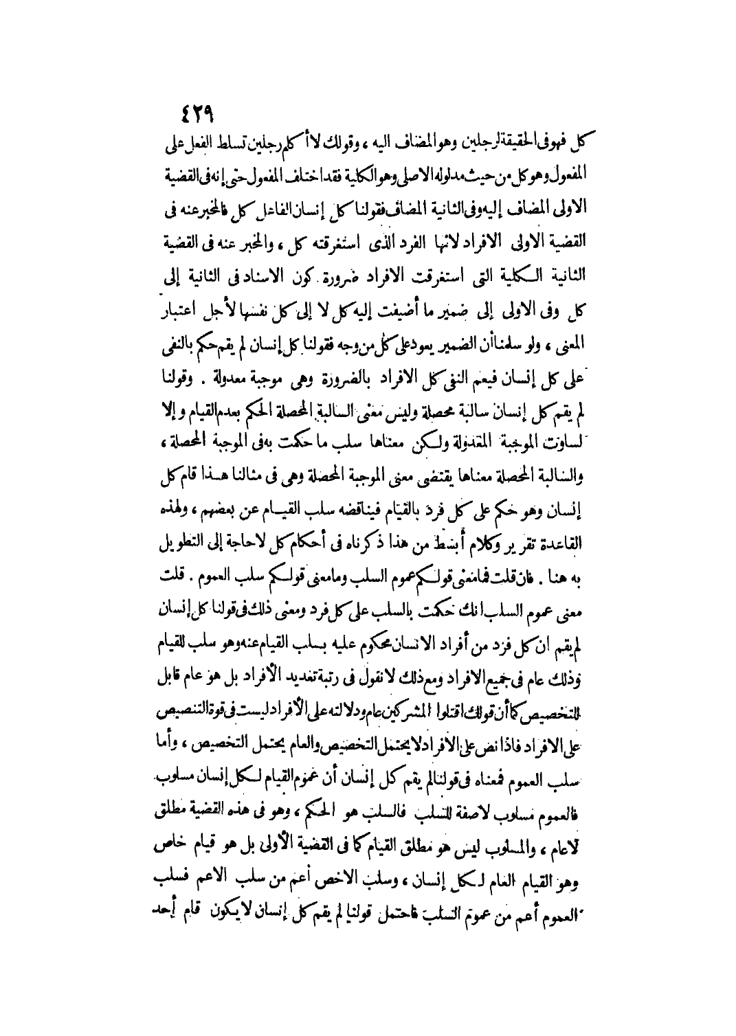 وَلَوْ سَلَّمْنَا أَنَّ الضَّمِيرَ يَعُودُ عَلَى " كُلُّ " مِنْ وَجْهٍ فَقَوْلُنَا: " كُلُّ إنْسَانٍ " لَمْ يَقُمْ حُكْمٌ بِالنَّفْيِ عَلَى كُلِّ إنْسَانٍ فَيَعُمُّ النَّفْيُ كُلَّ الْأَفْرَادِ بِالضَّرُورَةِ، وَهِيَ مُوجَبَةٌ مَعْدُولَةٌ. وَقَوْلُنَا لَمْ يَقُمْ كُلُّ إنْسَانٍ سَالِبَةٌ مُحَصِّلَةٌ وَلَيْسَ مَعْنَى السَّالِبَةِ الْمُحَصِّلَةِ الْحُكْمَ بِعَدَمِ الْقِيَامِ وَإِلَّا لَسَاوَتْ الْمُوجِبَةَ الْمَعْدُولَةَ وَلَكِنَّ مَعْنَاهَا سَلْبُ مَا حَكَمَتْ بِهِ فِي الْمُوجَبَةِ الْمُحَصَّلَةِ، وَالسَّالِبَةُ الْمُحَصَّلَةُ مَعْنَاهَا يَقْتَضِي مَعْنَى الْمُوجِبَةِ الْمُحَصِّلَةِ وَهِيَ فِي مِثَالِنَا هَذَا قَامَ كُلُّ إنْسَانٍ، وَهُوَ حُكْمٌ عَلَى كُلِّ فَرْدٍ بِالْقِيَامِ فَيُنَاقِضُهُ سَلْبُ الْقِيَامِ عَنْ بَعْضِهِمْ، وَلِهَذِهِ الْقَاعِدَةِ تَقْرِيرٌ وَكَلَامٌ أَبْسَطُ مِنْ هَذَا ذَكَرْنَاهُ فِي أَحْكَامِ " كُلَّ " لَا حَاجَةَ إلَى التَّطْوِيلِ بِهِ هُنَا. فَإِنْ قُلْت فَمَا مَعْنَى قَوْلِكُمْ عُمُومُ السَّلْبِ وَمَا مَعْنَى قَوْلِكُمْ سَلْبُ الْعُمُومِ. قُلْت مَعْنَى عُمُومِ السَّلْبِ أَنَّك حَكَمْت بِالسَّلْبِ عَلَى كُلِّ فَرْدٍ وَمَعْنَى ذَلِكَ فِي قَوْلِنَا " كُلُّ إنْسَانٍ " لَمْ يَقُمْ أَنَّ كُلَّ فَرْدٍ مِنْ أَفْرَادِ الْإِنْسَانِ مَحْكُومٌ عَلَيْهِ بِسَلْبِ الْقِيَامِ عَنْهُ وَهُوَ سَلْبٌ لِلْقِيَامِ وَذَلِكَ عَامٌّ فِي جَمِيعِ الْأَفْرَادِ وَمَعَ ذَلِكَ لَا نَقُولُ فِي رُتْبَةِ تَعْدِيدِ الْأَفْرَادِ بَلْ هُوَ عَامٌّ قَابِلٌ لِلتَّخْصِيصِ كَمَا أَنَّ قَوْلَك: اُقْتُلُوا الْمُشْرِكِينَ عَامٌّ وَدَلَالَتُهُ عَلَى الْأَفْرَادِ لَيْسَتْ فِي قُوَّةِ التَّنْصِيصِ عَلَى الْأَفْرَادِ فَإِذَا نَصَّ عَلَى الْأَفْرَادِ لَا يَحْتَمِلُ التَّخْصِيصَ وَالْعَامُّ يَحْتَمِلُ التَّخْصِيصَ، وَأَمَّا سَلْبُ الْعُمُومِ فَمَعْنَاهُ فِي قَوْلِنَا لَمْ يَقُمْ كُلُّ إنْسَانٍ أَنَّ عُمُومَ الْقِيَامِ لِكُلِّ إنْسَانٍ مَسْلُوبٌ فَالْعُمُومُ مَسْلُوبٌ لَا صِفَةٌ لِلسَّلْبِ فَالسَّلْبُ هُوَ الْحُكْمُ، وَهُوَ فِي هَذِهِ الْقَضِيَّةِ مُطْلَقٌ لَا عَامٌّ، وَالْمَسْلُوبُ لَيْسَ هُوَ مُطْلَقُ الْقِيَامِ كَمَا فِي الْقَضِيَّةِ الْأُولَى بَلْ هُوَ قِيَامٌ خَاصٌّ، وَهُوَ الْقِيَامُ الْعَامُّ لِكُلِّ إنْسَانٍ، وَسَلْبُ الْأَخَصِّ أَعَمُّ مِنْ سَلْبِ الْأَعَمِّ فَسَلْبُ الْعُمُومِ أَعَمُّ مِنْ عُمُومِ السَّلْبِ فَاحْتَمَلَ قَوْلُنَا لَمْ يَقُمْ كُلُّ إنْسَانٍ لَا يَكُونُ قَامَ أَحَدٌ