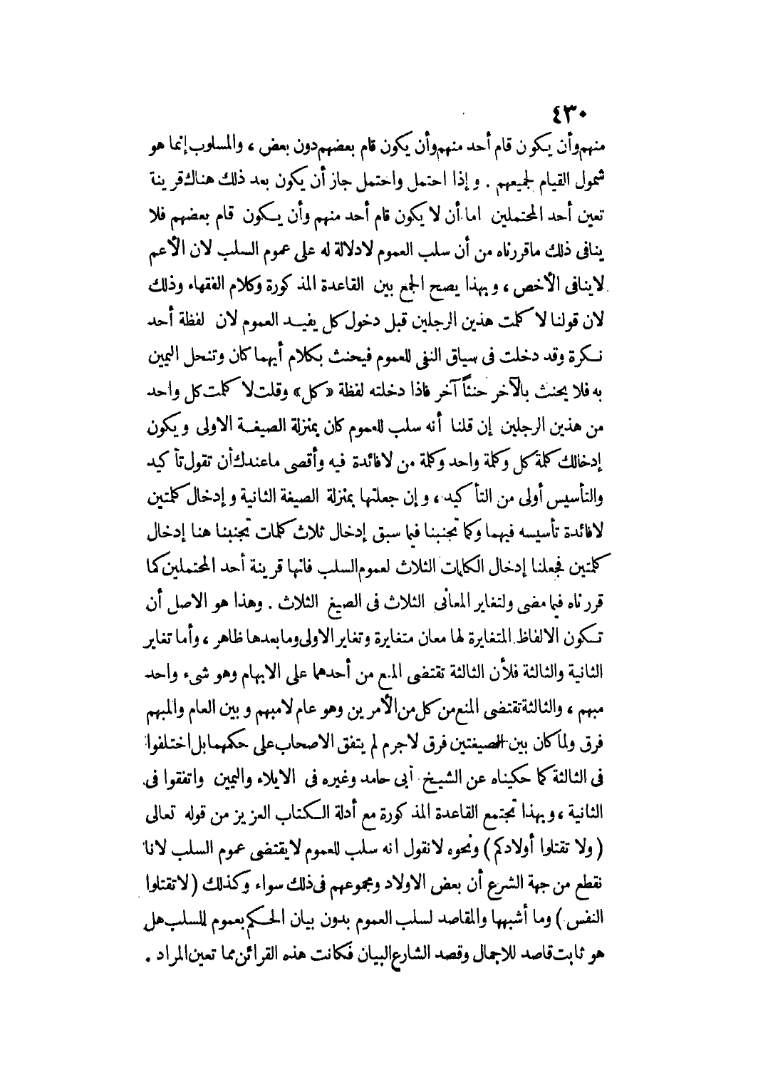 مِنْهُمْ وَأَنْ يَكُونَ قَامَ أَحَدٌ مِنْهُمْ وَأَنْ يَكُونَ قَامَ بَعْضُهُمْ دُونَ بَعْضٍ، وَالْمَسْلُوبُ إنَّمَا هُوَ شُمُولُ الْقِيَامِ لِجَمِيعِهِمْ. وَإِذَا احْتَمَلَ وَاحْتَمَلَ جَازَ أَنْ يَكُونَ بَعْدَ ذَلِكَ هُنَاكَ قَرِينَةٌ تُعِينُ أَحَدَ الْمُحْتَمَلَيْنِ إمَّا أَنْ لَا يَكُونَ قَامَ أَحَدٌ مِنْهُمْ وَأَنْ يَكُونَ قَامَ بَعْضُهُمْ فَلَا يُنَافِي ذَلِكَ مَا قَرَّرْنَاهُ مِنْ أَنَّ سَلْبَ الْعُمُومِ لَا دَلَالَةَ لَهُ عَلَى عُمُومِ السَّلْبِ لِأَنَّ الْأَعَمَّ لَا يُنَافِي الْأَخَصَّ، وَبِهَذَا يَصِحُّ الْجَمْعُ بَيْنَ الْقَاعِدَةِ الْمَذْكُورَةِ، وَكَلَامِ الْفُقَهَاءِ وَذَلِكَ لِأَنَّ قَوْلَنَا لَا كَلَّمْت هَذَيْنِ الرَّجُلَيْنِ قَبْلَ دُخُولِ " كُلّ " يُفِيدُ الْعُمُومَ لِأَنَّ لَفْظَةَ أَحَدٍ نَكِرَةٌ وَقَدْ دَخَلَتْ فِي سِيَاقِ النَّفْيِ لِلْعُمُومِ فَيَحْنَثُ بِكَلَامِ أَيِّهِمَا كَانَ وَتَنْحَلُّ الْيَمِينُ بِهِ فَلَا يَحْنَثُ بِالْآخَرِ حِنْثًا آخَرَ فَإِذَا دَخَلَتْهُ لَفْظَةُ " كُلّ " وَقُلْت لَا كَلَّمْت كُلَّ وَاحِدٍ مِنْ هَذَيْنِ الرَّجُلَيْنِ إنْ قُلْنَا: إنَّهُ سَلْبٌ لِلْعُمُومِ كَانَ بِمَنْزِلَةِ الصِّيغَةِ الْأُولَى وَيَكُونُ إدْخَالُك كَلِمَةِ " كُلُّ وَاحِدٍ " وَكَلِمَةِ " مِنْ لَا فَائِدَةَ فِيهِ " وَأَقْصَى مَا عِنْدَك أَنْ تَقُولَ تَأْكِيدٌ وَالتَّأْسِيسُ أَوْلَى مِنْ التَّأْكِيدِ، وَإِنْ جَعَلْتهَا بِمَنْزِلَةِ الصِّيغَةِ الثَّانِيَةِ وَإِدْخَالِ كَلِمَتَيْنِ لَا فَائِدَةَ تَأْسِيسُهُ فِيهِمَا وَكَمَا تَجَنَّبْنَا فِيمَا سَبَقَ إدْخَالَ ثَلَاثِ كَلِمَاتٍ تَجَنَّبْنَا هُنَا إدْخَالَ كَلِمَتَيْنِ فَجَعَلْنَا إدْخَالَ الْكَلِمَاتِ الثَّلَاثِ لِعُمُومِ السَّلْبِ فَإِنَّهَا قَرِينَةُ أَحَدِ الْمُحْتَمَلَيْنِ كَمَا قَرَّرْنَاهُ فِيمَا مَضَى وَلِتَغَايُرِ الْمَعَانِي الثَّلَاثِ فِي الصِّيَغِ الثَّلَاثِ. وَهَذَا هُوَ الْأَصْلُ أَنْ تَكُونَ الْأَلْفَاظُ الْمُتَغَايِرَةُ لَهَا مَعَانٍ مُتَغَايِرَةٍ الْأُولَى وَمَا بَعْدَهَا ظَاهِرٌ، وَأَمَّا تَغَايُرُ الثَّانِيَةِ وَالثَّالِثَةِ فَلِأَنَّ الثَّالِثَةَ تَقْتَضِي الْمَنْعَ مِنْ أَحَدِهِمَا عَلَى الْإِبْهَامِ وَهُوَ شَيْءٌ وَاحِدٌ مُبْهَمٌ، وَالثَّالِثَةُ تَقْتَضِي الْمَنْعَ مِنْ كُلٍّ مِنْ الْأَمْرَيْنِ وَهُوَ عَامٌّ لَا مُبْهَمٌ وَبَيْنَ الْعَامِّ وَالْمُبْهَمِ فَرْقٌ وَلَمَّا كَانَ بَيْنَ الصِّيغَتَيْنِ فَرْقٌ لَا جَرَمَ لَمْ يَتَّفِقْ الْأَصْحَابُ عَلَى حُكْمِهِمَا بَلْ اخْتَلَفُوا فِي الثَّالِثَةِ كَمَا حَكَيْنَاهُ عَنْ الشَّيْخِ أَبِي حَامِدٍ وَغَيْرِهِ فِي الْإِيلَاءِ وَالْيَمِينِ وَاتَّفَقُوا فِي الثَّانِيَةِ، وَبِهَذَا تَجْتَمِعُ الْقَاعِدَةُ الْمَذْكُورَةُ مَعَ أَدِلَّةِ الْكِتَابِ الْعَزِيزِ مِنْ قَوْله تَعَالَى {وَلا تَقْتُلُوا أَوْلادَكُمْ} [الإسراء: 31] وَنَحْوَهُ لَا نَقُولُ إنَّهُ سَلْبٌ لِلْعُمُومِ لَا يَقْتَضِي عُمُومَ السَّلْبِ لِأَنَّا نَقْطَعُ مِنْ جِهَةِ الشَّرْعِ أَنَّ بَعْضَ الْأَوْلَادِ وَمَجْمُوعَهُمْ فِي ذَلِكَ سَوَاءٌ وَكَذَلِكَ {وَلا تَقْتُلُوا النَّفْسَ} [الإسراء: 33] وَمَا أَشْبَهُهَا وَالْمَقَاصِدُ لِسَلْبِ الْعُمُومِ بِدُونِ بَيَانِ الْحُكْمِ بِعُمُومِ السَّلْبِ هَلْ هُوَ ثَابِتٌ قَاصِدٌ لِلْإِجْمَالِ وَقَصَدَ الشَّارِعُ الْبَيَانَ فَكَانَتْ هَذِهِ الْقَرَائِنُ مِمَّا تُعَيِّنُ الْمُرَادَ.
