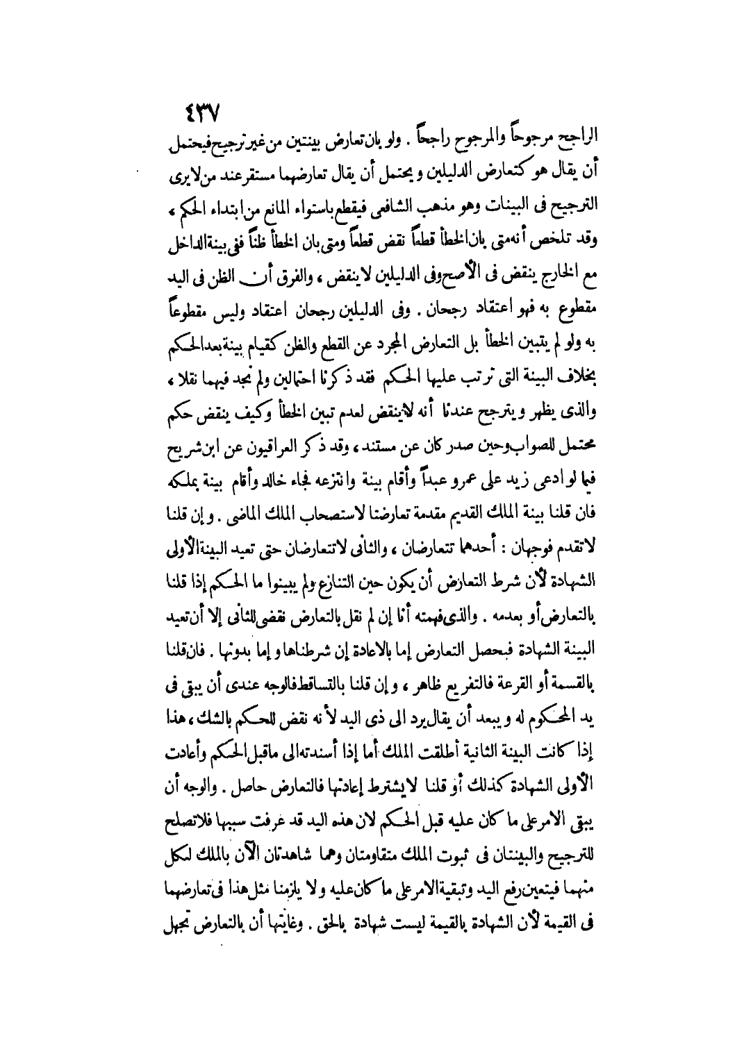 وَلَوْ بَانَ تَعَارُضُ بَيِّنَتَيْنِ مِنْ غَيْرِ تَرْجِيحٍ فَيُحْتَمَلُ أَنْ يُقَالَ هُوَ كَتَعَارُضِ الدَّلِيلَيْنِ، وَيُحْتَمَلُ أَنْ يُقَالَ تَعَارُضُهُمَا مُسْتَقِرٌّ عِنْدَ مَنْ لَا يَرَى التَّرْجِيحَ فِي الْبَيِّنَاتِ، وَهُوَ مَذْهَبُ الشَّافِعِيِّ فَيَقْطَعُ بِاسْتِوَاءِ الْمَانِعِ مِنْ ابْتِدَاءِ الْحُكْمِ، وَقَدْ تَلَخَّصَ أَنَّهُ مَتَى بَانَ الْخَطَأُ قَطْعًا نُقِضَ قَطْعًا وَمَتَى بَانَ الْخَطَأُ ظَنًّا فَفِي بَيِّنَةِ الدَّاخِلِ مَعَ الْخَارِجِ يُنْقَضُ فِي الْأَصَحِّ وَفِي الدَّلِيلَيْنِ لَا يُنْقَضُ، وَالْفَرْقُ أَنَّ الظَّنَّ فِي الْيَدِ مَقْطُوعٌ بِهِ فَهُوَ اعْتِقَادُ رُجْحَانٍ.