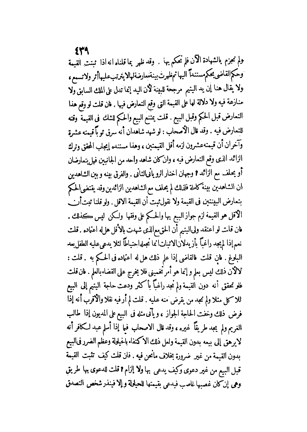 وَقَدْ ظَهَرَ بِمَا قُلْنَاهُ إنَّهُ إذَا ثَبَتَتْ الْقِيمَةُ وَحَكَمَ الْقَاضِي بِحُكْمٍ مُسْتَنِدًا إلَيْهَا ثُمَّ ظَهَرَتْ بَيِّنَةٌ مُعَارِضَةٌ لَهَا لَا يَتَرَتَّبُ عَلَيْهَا أَثَرٌ وَلَا تُسْمَعُ، وَلَا يُقَالُ هُنَا إنَّ يَدَ الْيَتِيمِ مُرَجِّحَةٌ لِلْبَيِّنَةِ لِأَنَّ الْيَدَ إنَّمَا تَدُلُّ عَلَى الْمِلْكِ السَّابِقِ، وَلَا مُنَازَعَةَ فِيهِ وَلَا دَلَالَةَ لَهَا عَلَى الْقِيمَةِ الَّتِي وَقَعَ التَّعَارُضُ فِيهَا. فَإِنْ قُلْت لَوْ وَقَعَ هَذَا التَّعَارُضُ قَبْلَ الْحُكْمِ وَقَبْلَ الْبَيْعِ. قُلْت: يَمْتَنِعُ الْبَيْعُ، وَالْحُكْمُ لِلشَّكِّ فِي الْقِيمَةِ وَقْتَهُ لِلتَّعَارُضِ فِيهِ.
