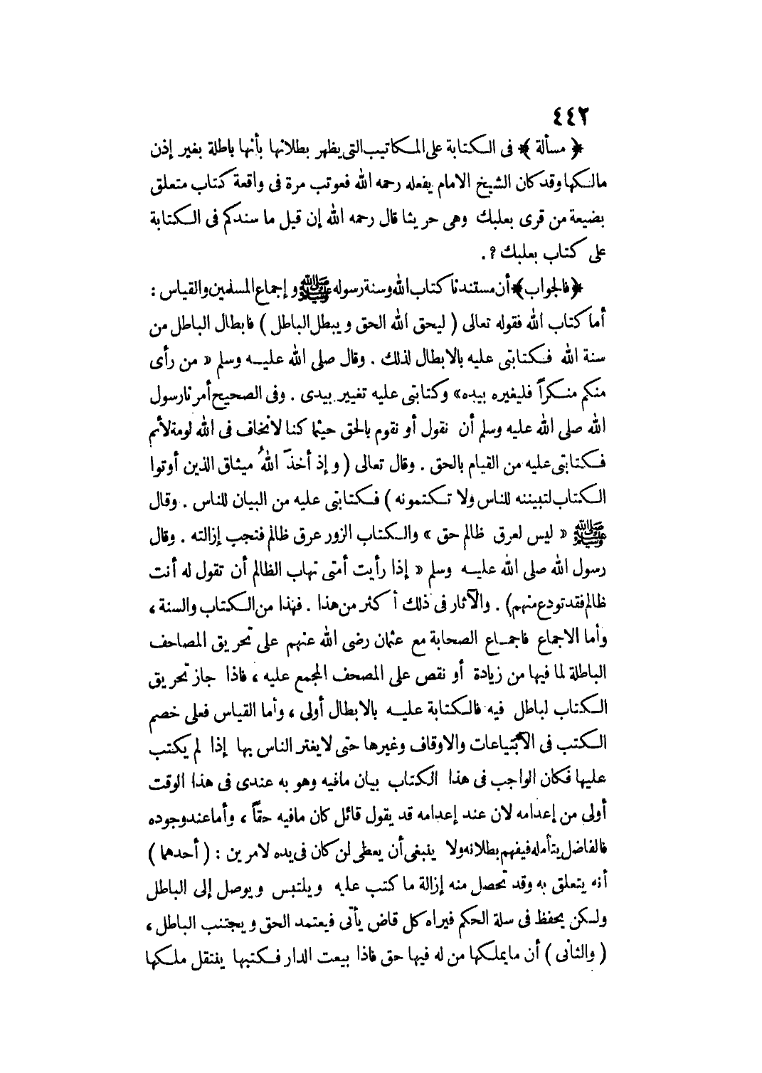 (فَالْجَوَابُ) أَنَّ مُسْتَنَدَنَا كِتَابُ اللَّهِ وَسُنَّةُ رَسُولِهِ - صَلَّى اللَّهُ عَلَيْهِ وَسَلَّمَ - وَإِجْمَاعُ الْمُسْلِمِينَ وَالْقِيَاسُ: أَمَّا كِتَابُ اللَّهِ، فَقَوْلُهُ تَعَالَى {لِيُحِقَّ الْحَقَّ وَيُبْطِلَ الْبَاطِلَ} [الأنفال: 8] فَإِبْطَالُ الْبَاطِلِ مِنْ سُنَّةِ اللَّهِ فَكِتَابَتِي عَلَيْهِ بِالْإِبْطَالِ لِذَلِكَ. وَقَالَ - صَلَّى اللَّهُ عَلَيْهِ وَسَلَّمَ - «مَنْ رَأَى مِنْكُمْ مُنْكَرًا فَلْيُغَيِّرْهُ بِيَدِهِ» وَكِتَابَتِي عَلَيْهِ تَغْيِيرٌ بِيَدِي.