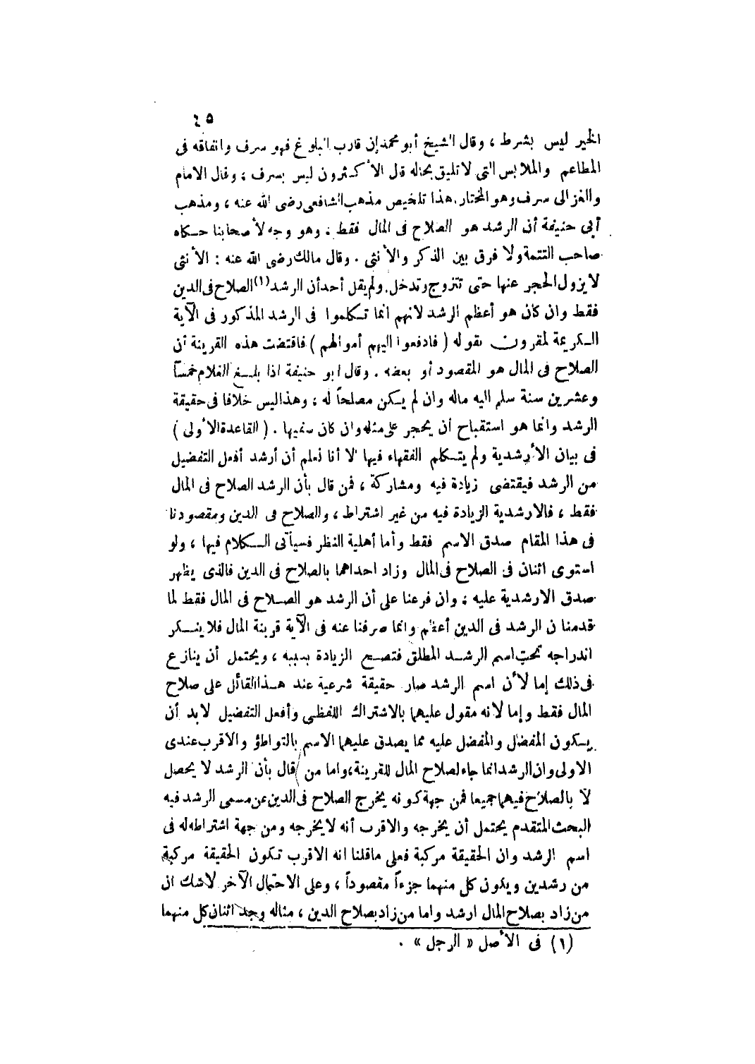 وَلَمْ يَقُلْ أَحَدٌ إنَّ الرُّشْدَ الصَّلَاحُ فِي الدِّينِ فَقَطْ وَإِنْ كَانَ هُوَ أَعْظَمَ الرُّشْدِ لِأَنَّهُمْ إنَّمَا تَكَلَّمُوا فِي الرُّشْدِ الْمَذْكُورِ فِي الْآيَةِ الْكَرِيمَةِ الْمَقْرُونِ بِقَوْلِهِ {فَادْفَعُوا إِلَيْهِمْ أَمْوَالَهُمْ} [النساء: 6] فَاقْتَضَتْ هَذِهِ الْقَرِينَةُ أَنَّ الصَّلَاحَ فِي الْمَالِ هُوَ الْمَقْصُودُ أَوْ بَعْضُهُ.