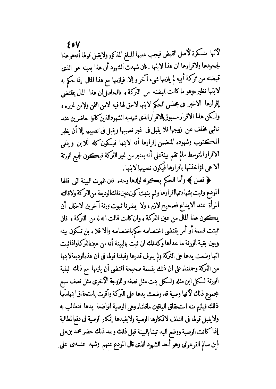 (فَصْلٌ) وَأَمَّا الْحُكْمُ بِكَوْنِهِ لِوَلَدِهَا وَحْدَهُ فَإِنْ ظَهَرَتْ الْبَيِّنَةُ الَّتِي قَالَهَا الْمُودَعُ وَثَبَتَ بِشَهَادَتِهَا إقْرَارُهَا وَلَمْ يَثْبُتْ كَوْنُ عَيْنِ تِلْكَ الْوَدِيعَةِ مِنْ التَّرِكَةِ وَلَا قَالَتْهُ الْمَرْأَةُ عِنْدَ الْإِيدَاعِ فَصَحِيحٌ لَازِمٌ، وَلَا يَضُرُّنَا ثُبُوتُ وَرَثَةٍ آخَرِينَ لِاحْتِمَالِ أَنْ يَكُونَ هَذَا الْمَالُ مِنْ عَيْنِ التَّرِكَةِ، وَإِنْ كَانَتْ قَالَتْ: إنَّهُ لَهُ مِنْ التَّرِكَةِ، فَإِنْ ثَبَتَتْ قِسْمَةٌ أَوْ أَمْرٌ يَقْتَضِي اخْتِصَاصَهُ حُكِمَ بِاخْتِصَاصِهِ وَإِلَّا فَلَا، بَلْ تَكُونُ بَيْنَهُ وَبَيْنَ بَقِيَّةِ الْوَرَثَةِ مَا عَدَاهَا وَكَذَلِكَ إنْ ثَبَتَ بِالْبَيِّنَةِ أَنَّهُ مِنْ عَيْنِ التَّرِكَةِ وَإِذَا ثَبَتَ أَنَّهَا وَضَعَتْ يَدَهَا عَلَى التَّرِكَةِ وَلَمْ يُعْرَفْ قَدْرُهَا وَقَبِلْنَا قَوْلَهَا فِي أَنَّ هَذِهِ الْوَدِيعَةَ لِابْنِهَا مِنْ التَّرِكَةِ وَحَمَلْنَاهُ عَلَى أَنَّ ذَلِكَ بِقِسْمَةٍ صَحِيحَةٍ اقْتَضَى أَنْ يَلْزَمَهَا مَعَ ذَلِكَ لِبَقِيَّةِ الْوَرَثَةِ لِكُلِّ ابْنٍ مِثْلُهُ وَلِكُلِّ بِنْتٍ مِثْلُ نِصْفِهِ وَلِلزَّوْجَةِ الْأُخْرَى مِثْلُ نِصْفِ سُبْعِ مَجْمُوعِ ذَلِكَ لِأَنَّهَا وَصِيَّةٌ قَدْ وَضَعَتْ يَدَهَا عَلَى التَّرِكَةِ وَأَقَرَّتْ بِاسْتِحْقَاقِ ابْنِهَا مِنْهَا ذَلِكَ فَيَلْزَمُ مِنْهُ اسْتِحْقَاقُ الْبَاقِينَ مَا قُلْنَاهُ وَهِيَ الْوَصِيَّةُ الْوَاضِعَةُ يَدَهَا فَتُطَالَبُ بِهِ وَلَا يُقْبَلُ قَوْلُهَا فِي التَّلَفِ لِإِنْكَارِهَا الْوَصِيَّةَ وَلَا يُفِيدُهَا إنْكَارُ الْوَصِيَّةِ فِي دَفْعِ الْمُطَالَبَةِ إذَا كَانَتْ الْوَصِيَّةُ وَوَضْعُ الْيَدِ ثَبَتَا بِالْبَيِّنَةِ قَبْلَ ذَلِكَ وَبَعْدَ ذَلِكَ حَضَرَ مُحَمَّدُ بْنُ عَلِيِّ بْنِ سَالِمٍ الْقَرْعُونِيُّ وَهُوَ أَحَدُ الشُّهُودِ الَّذِي قَالَ الْمُودَعُ عَنْهُمْ وَشَهِدَ عِنْدِي عَلَى