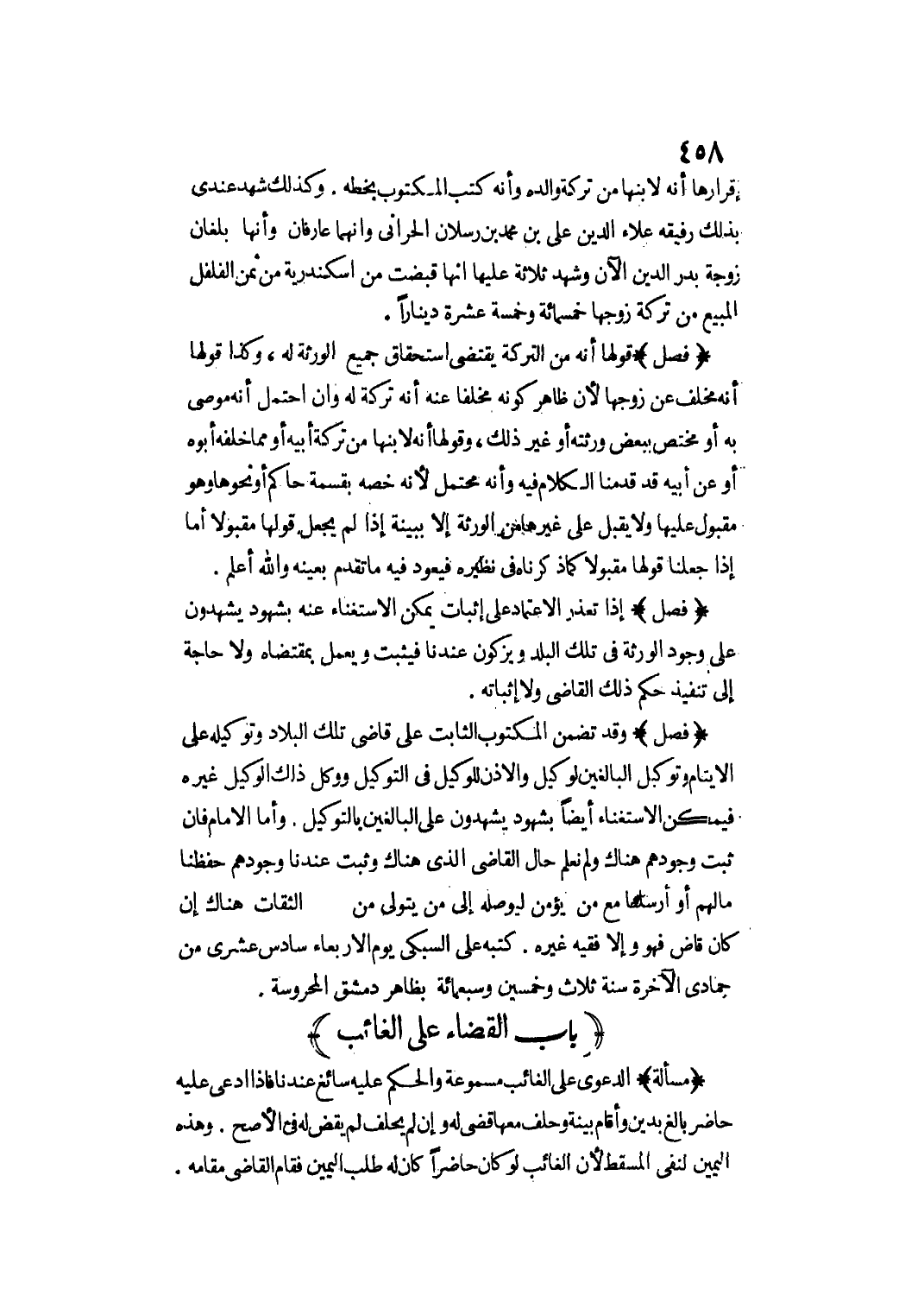 إقْرَارِهَا أَنَّهُ لِابْنِهَا مِنْ تَرِكَةِ وَالِدِهِ وَأَنَّهُ كَتَبَ الْمَكْتُوبَ بِخَطِّهِ. وَكَذَلِكَ شَهِدَ عِنْدِي بِذَلِكَ رَفِيقُهُ عَلَاءُ الدِّينِ عَلِيُّ بْنُ رَسْلَانَ الْحَرَّانِيُّ وَإِنَّهُمَا عَارِفَانِ وَإِنَّهُمَا بَالِغَانِ زَوْجَةَ بَدْرِ الدِّينِ الْآنَ وَشَهِدَ ثَلَاثَةٌ عَلَيْهَا إنَّهَا قَبَضَتْ مِنْ إسْكَنْدَرِيَّةَ مِنْ ثَمَنِ الْفُلْفُلِ الْمَبِيعِ مِنْ تَرِكَةِ زَوْجِهَا خَمْسَمِائَةٍ وَخَمْسَةَ عَشْرَةَ دِينَارًا.