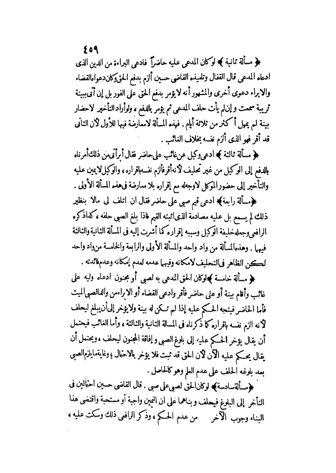 (مَسْأَلَةٌ ثَالِثَةٌ) ادَّعَى وَكِيلٌ عَنْ غَائِبٍ عَلَى حَاضِرٍ فَقَالَ: أَبْرَأَنِي مِنْ ذَلِكَ أَمَرْنَاهُ بِالدَّفْعِ إلَى الْوَكِيلِ مِنْ غَيْرِ تَحْلِيفٍ؛ لِأَنَّهُ أَقَرَّ فَأَلْزَمَ نَفْسَهُ بِإِقْرَارِهِ، وَالْوَكِيلُ لَا يَمِينَ عَلَيْهِ وَالتَّأْخِيرُ إلَى حُضُورِ الْمُوَكِّلِ لَا وَجْهَ لَهُ مَعَ إقْرَارِهِ بِلَا مُعَارَضَةٍ فِي هَذِهِ الْمَسْأَلَةِ الْأُولَى.