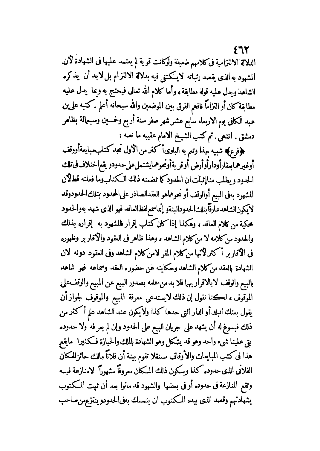 الدَّلَالَةُ الِالْتِزَامِيَّةُ فِي كَلَامِهِمْ ضَعِيفَةً وَلَوْ كَانَتْ قَوِيَّةً لَمْ يُعْتَمَدْ عَلَيْهَا فِي الشَّهَادَةِ؛ لِأَنَّ الْمَشْهُودَ بِهِ الَّذِي يَقْصِدُ إثْبَاتَهُ لَا يُكْتَفَى فِيهِ بِدَلَالَةِ الِالْتِزَامِ بَلْ لَا بُدَّ أَنْ يَذْكُرَهُ الشَّاهِدُ وَيَدُلُّ عَلَيْهِ قَوْلُهُ مُطَابَقَةً، وَأَمَّا كَلَامُ اللَّهِ تَعَالَى فَيُحْتَجُّ بِهِ وَبِمَا يَدُلُّ عَلَيْهِ مُطَابَقَةً كَانَ أَوْ الْتِزَامًا فَافْهَمْ الْفَرْقَ بَيْنَ الْمَوْضِعَيْنِ. وَاَللَّهُ سُبْحَانَهُ أَعْلَمُ.