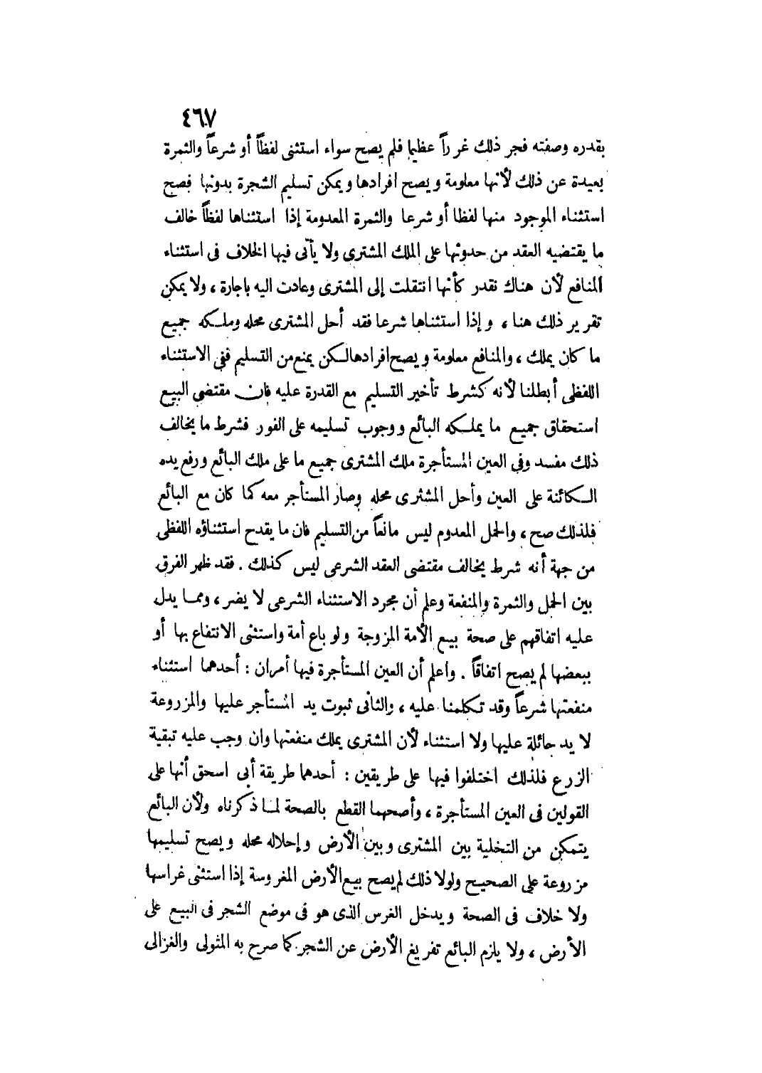 بِقَدْرِهِ وَصِفَتِهِ فَجَرَّ ذَلِكَ غَرَرًا عَظِيمًا فَلَمْ يَصِحَّ سَوَاءٌ اسْتَثْنَى لَفْظًا أَوْ شَرْعًا وَالثَّمَرَةُ بَعِيدَةٌ عَنْ ذَلِكَ؛ لِأَنَّهَا مَعْلُومَةٌ وَيَصِحُّ إفْرَادُهَا وَيُمْكِنُ تَسْلِيمُ الشَّجَرَةِ بِدُونِهَا فَصَحَّ اسْتِثْنَاءُ الْمَوْجُودِ مِنْهَا لَفْظًا أَوْ شَرْعًا وَالثَّمَرَةُ الْمَعْدُومَةُ إذَا اسْتَثْنَاهَا لَفْظًا خَالَفَ مَا يَقْتَضِيه الْعَقْدُ مِنْ حُدُوثِهَا عَلَى الْمِلْكِ الْمُشْتَرَى وَلَا يَأْتِي فِيهَا الْخِلَافُ فِي اسْتِثْنَاءِ الْمَنَافِعِ؛ لِأَنَّ هُنَاكَ نُقَدِّرُ كَأَنَّهَا انْتَقَلَتْ إلَى الْمُشْتَرِي وَعَادَتْ إلَيْهِ بِإِجَارَةٍ، وَلَا يُمْكِنُ تَقْرِيرُ ذَلِكَ هُنَا، وَإِذَا اسْتَثْنَاهَا شَرْعًا فَقَدْ أَحَلَّ الْمُشْتَرِي مَحَلَّهُ وَمَلَّكَهُ جَمِيعَ مَا كَانَ يَمْلِكُ، وَالْمَنَافِعُ مَعْلُومَةٌ وَيَصِحُّ إفْرَادُهَا لَكِنْ يُمْنَعُ مِنْ التَّسْلِيمِ فَفِي الِاسْتِثْنَاءِ اللَّفْظِيِّ أَبْطَلْنَا؛ لِأَنَّهُ كَشَرْطِ تَأْخِيرِ التَّسْلِيمِ مَعَ الْقُدْرَةِ عَلَيْهِ فَإِنَّ مُقْتَضَى الْبَيْعِ اسْتِحْقَاقُ جَمِيعِ مَا يَمْلِكُهُ الْبَائِعُ وَوُجُوبُ تَسْلِيمِهِ عَلَى الْفَوْرِ فَشَرْطُ مَا يُخَالِفُ ذَلِكَ مُفْسِدٌ وَفِي الْعَيْنِ الْمُسْتَأْجَرَةِ مَلَكَ الْمُشْتَرِي جَمِيعَ مَا عَلَى مِلْكِ الْبَائِعِ وَرَفَعَ يَدَهُ الْكَائِنَةَ عَلَى الْعَيْنِ وَأَحَلَّ الْمُشْتَرِي مَحَلَّهُ وَصَارَ الْمُسْتَأْجِرُ مَعَهُ كَمَا كَانَ مَعَ الْبَائِعِ فَلِذَلِكَ صَحَّ، وَالْحَمْلُ الْمَعْدُومُ لَيْسَ مَانِعًا مِنْ التَّسْلِيمِ فَإِنَّ مَا يُقْدَحُ اسْتِثْنَاؤُهُ اللَّفْظِيُّ مِنْ جِهَةِ أَنَّهُ شَرْطٌ يُخَالِفُ مُقْتَضَى الْعَقْدِ الشَّرْعِيِّ لَيْسَ كَذَلِكَ.