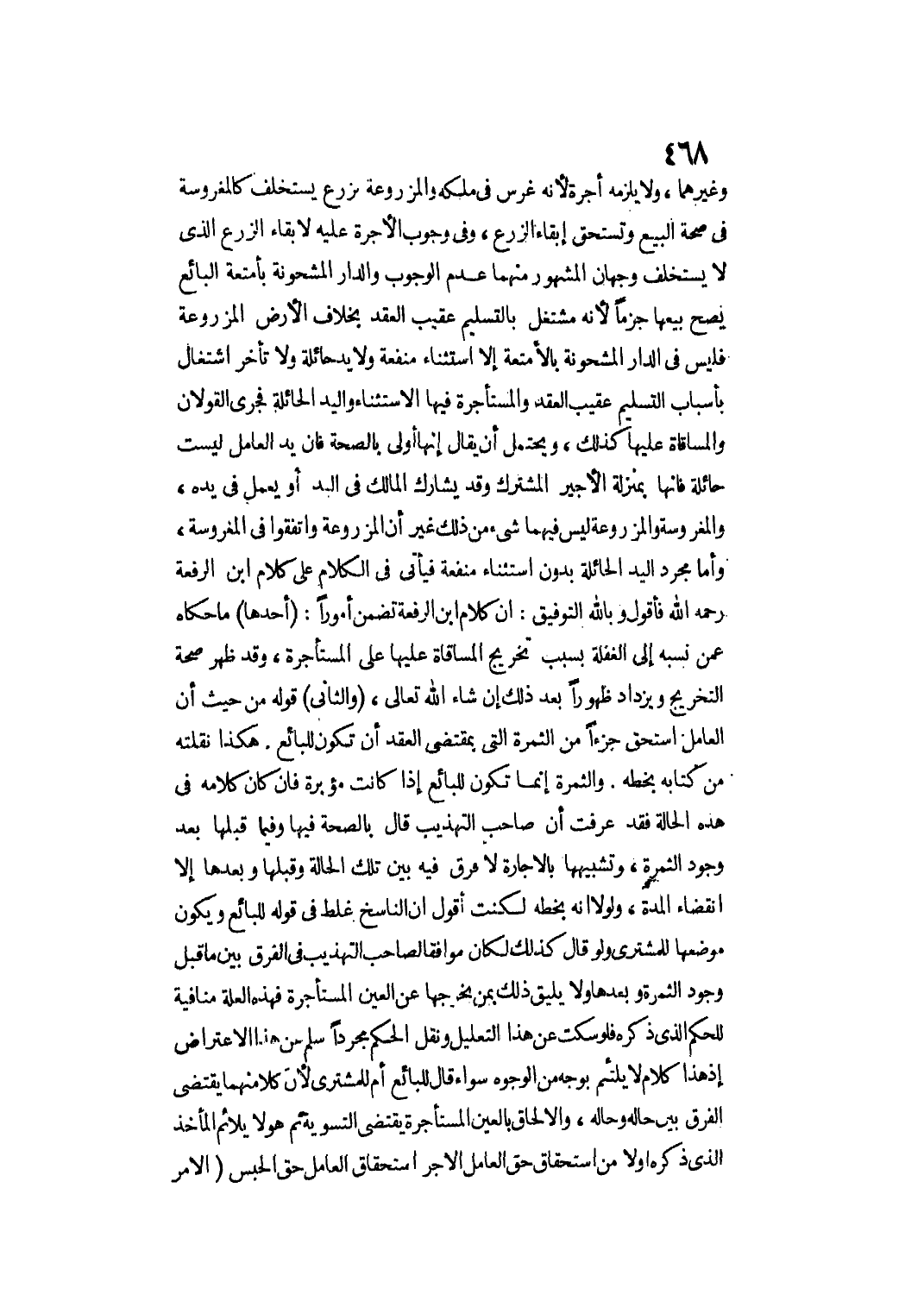وَفِي وُجُوبِ الْأُجْرَةِ عَلَيْهِ لِإِبْقَاءِ الزَّرْعِ الَّذِي لَا يُسْتَخْلَفُ وَجْهَانِ الْمَشْهُورُ مِنْهُمَا عَدَمُ الْوُجُوبِ وَالدَّارُ الْمَشْحُونَةُ بِأَمْتِعَةِ الْبَائِعِ يَصِحُّ بَيْعُهَا جَزْمًا؛ لِأَنَّهُ مُشْتَغِلٌ بِالتَّسْلِيمِ عَقِيبَ الْعَقْدِ بِخِلَافِ الْأَرْضِ الْمَزْرُوعَةِ فَلَيْسَ فِي الدَّارِ الْمَشْحُونَةِ بِالْأَمْتِعَةِ إلَّا اسْتِثْنَاءُ مَنْفَعَةٍ وَلَا يَدٌ حَائِلَةٌ وَلَا تَأَخُّرُ اشْتِغَالٍ بِأَسْبَابِ التَّسْلِيمِ عَقِيبَ الْعَقْدِ وَالْمُسْتَأْجَرَةُ فِيهَا الِاسْتِثْنَاءُ وَالْيَدُ الْحَائِلَةُ؛ فَجَرَى الْقَوْلَانِ وَالْمُسَاقَاةُ عَلَيْهَا كَذَلِكَ، وَيَحْتَمِلُ أَنْ يُقَالَ: إنَّهَا أَوْلَى بِالصِّحَّةِ فَإِنَّ يَدَ الْعَامِلِ لَيْسَتْ حَائِلَةً فَإِنَّهَا بِمَنْزِلَةِ الْأَجِيرِ الْمُشْتَرَكِ وَقَدْ يُشَارِكُ الْمَالِكُ فِي الْيَدِ أَوْ يَعْمَلُ فِي يَدِهِ، وَالْمَغْرُوسَةُ وَالْمَزْرُوعَةُ لَيْسَ فِيهِمَا شَيْءٌ مِنْ ذَلِكَ غَيْرَ أَنَّ الْمَزْرُوعَةَ فِيهَا خِلَافٌ وَاتَّفَقُوا فِي الْمَغْرُوسَةِ، وَأَمَّا مُجَرَّدُ الْيَدِ الْحَائِلَةِ بِدُونِ اسْتِثْنَاءِ مَنْفَعَةٍ فَيَأْتِي فِي الْكَلَامِ عَلَى كَلَامِ ابْنِ الرِّفْعَةِ - رَحِمَهُ اللَّهُ - فَأَقُولُ وَبِاَللَّهِ التَّوْفِيقُ: إنَّ كَلَامَ ابْنِ الرِّفْعَةِ تَضَمَّنَ أُمُورًا: