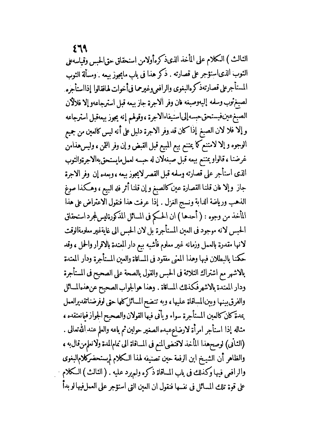(الثَّالِثُ) الْكَلَامُ عَلَى قُوَّةِ تِلْكَ الْمَسَائِلِ فِي نَفْسِهَا فَنَقُولُ: إنَّ الْعَيْنَ الَّتِي اُسْتُؤْجِرَ عَلَى الْعَمَلِ فِيهَا لَوْ بَدَأَ
