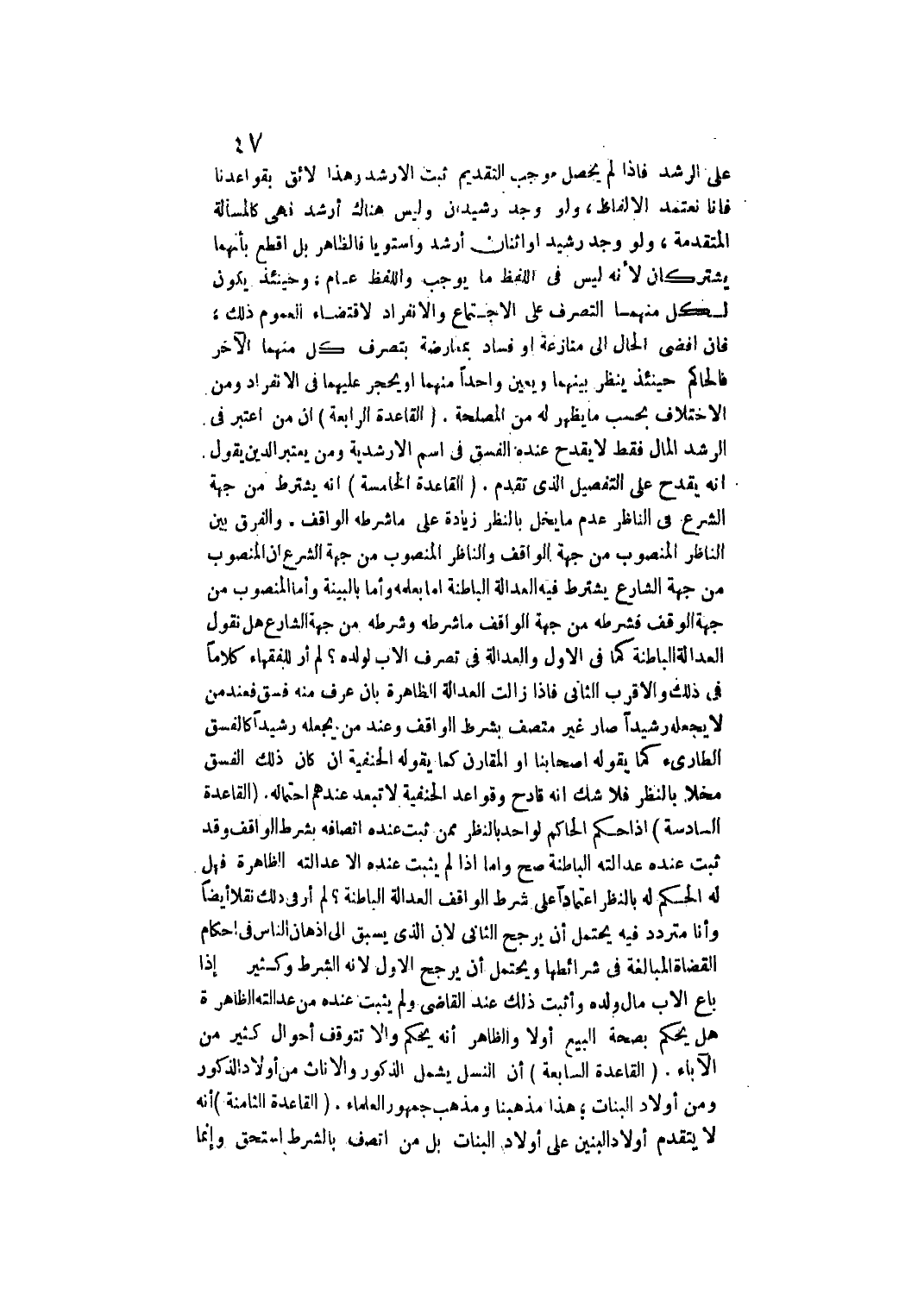 (الْقَاعِدَةُ الرَّابِعَةُ) إنَّ مَنْ اعْتَبَرَ فِي الرُّشْدِ الْمَالَ فَقَطْ لَا يَقْدَحُ عِنْدَهُ الْفِسْقُ فِي اسْمِ الْأَرْشَدِيَّةِ وَمَنْ يَعْتَبِرُ الدِّينَ يَقُولُ إنَّهُ يَقْدَحُ عَلَى التَّفْصِيلِ الَّذِي تَقَدَّمَ.