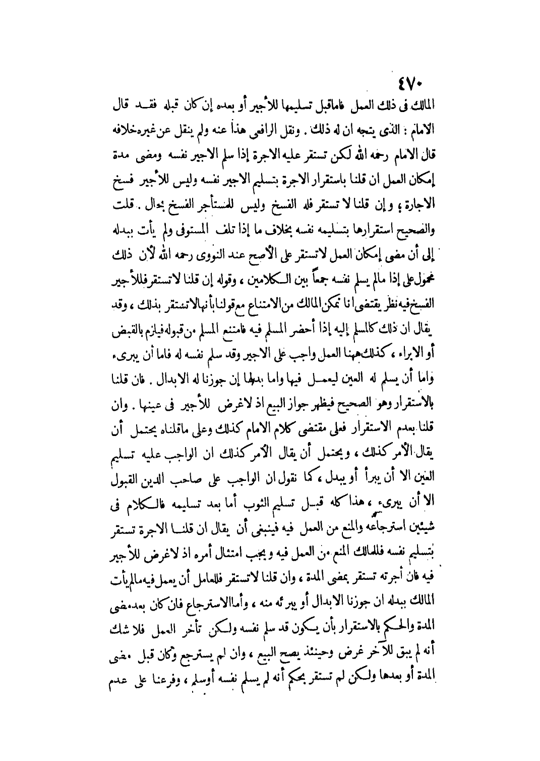 الْمَالِكُ فِي ذَلِكَ الْعَمَلِ فَإِمَّا قَبْلَ تَسْلِيمِهَا لِلْأَجِيرِ أَوْ بَعْدَهُ إنْ كَانَ قَبْلَهُ فَقَدْ قَالَ الْإِمَامُ: الَّذِي يَتَّجِهُ أَنَّ لَهُ ذَلِكَ.