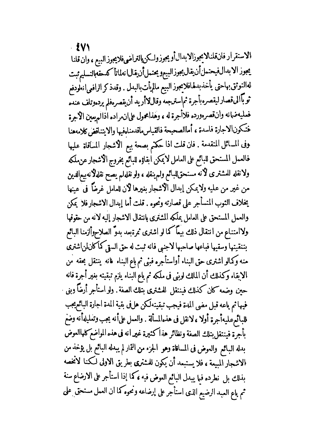 قُلْت: أَمَّا إبْدَالُ الْأَشْجَارِ فَلَا يُمْكِنُ وَالْعَمَلُ الْمُسْتَحِقُّ عَلَى الْعَامِلِ يَمْلِكُهُ الْمُشْتَرِي بِانْتِقَالِ الْأَشْجَارِ إلَيْهِ؛ لِأَنَّهُ مِنْ حُقُوقِهَا وَلَا امْتِنَاعَ مِنْ انْتِقَالِ ذَلِكَ بَيْعًا كَمَا لَوْ اشْتَرَى ثَمَرَةً بَعْدَ بُدُوِّ الصَّلَاحِ وَأَلْزَمْنَا الْبَائِعَ بِتَنْقِيَتِهَا وَسَقْيِهَا فَبَاعَهَا صَاحِبُهَا لِأَجْنَبِيِّ فَإِنَّهُ ثَبَتَ لَهُ حَقُّ السَّقْيِ كَمَا كَانَ لِمَنْ اشْتَرَى مِنْهُ وَكَمَا لَوْ اشْتَرَى حَقَّ الْبِنَاءِ أَوْ اسْتَأْجَرَهُ فَبَنَى ثُمَّ بَاعَ الْبِنَاءَ فَإِنَّهُ يَنْتَقِلُ بِحَقِّهِ مِنْ الْإِبْقَاءِ وَكَذَلِكَ أَنَّ الْمَالِكَ لَوْ بَنَى فِي مِلْكِهِ ثُمَّ بَاعَ الْبِنَاءَ يَلْزَمُ تَبْقِيَتُهُ بِغَيْرِ أُجْرَةٍ فَإِنَّهُ حِينَ وَضْعَهُ كَانَ كَذَلِكَ فَيَنْتَقِلُ لِلْمُشْتَرِي بِتِلْكَ الصِّفَةِ.