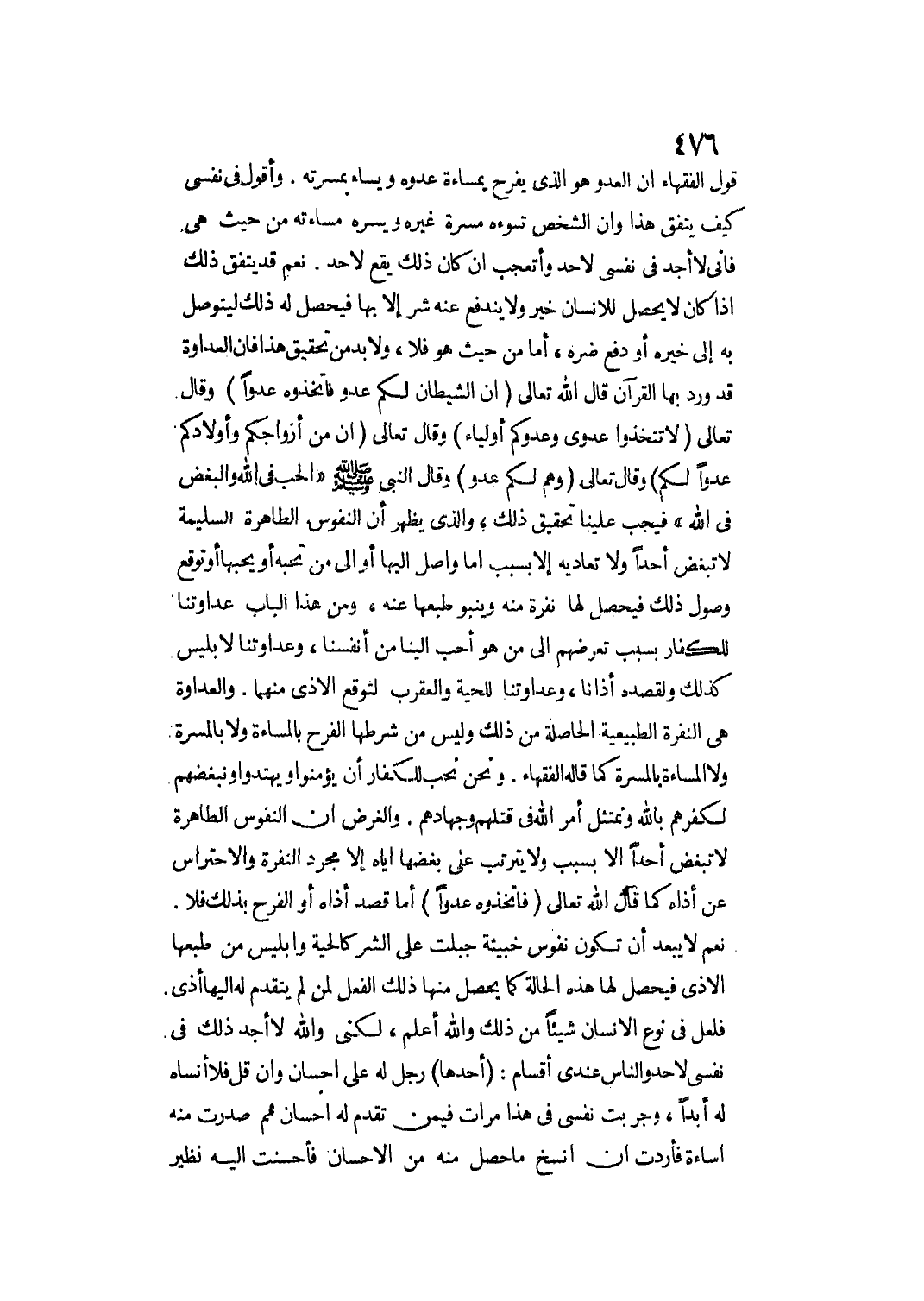 وَالْعَدَاوَةُ هِيَ النَّفْرَةُ الطَّبِيعِيَّةُ الْحَاصِلَةُ مِنْ ذَلِكَ وَلَيْسَ مِنْ شَرْطِهَا الْفَرَحُ بِالْمَسَاءَةِ وَلَا بِالْمَسَرَّةِ وَلَا الْمَسَاءَةُ بِالْمَسَرَّةِ كَمَا قَالَهُ الْفُقَهَاءُ.