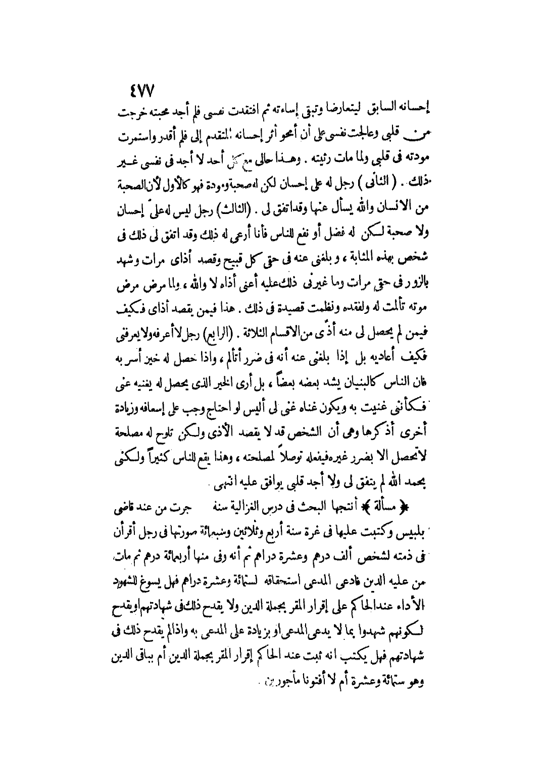 (الثَّالِثُ) رَجُلٌ لَيْسَ لَهُ عَلَيَّ إحْسَانٌ وَلَا صُحْبَةٌ لَكِنْ لَهُ فَضْلٌ أَوْ نَفْعٌ لِلنَّاسِ فَأَنَا أَرْعَى لَهُ ذَلِكَ، وَقَدْ اتَّفَقَ لِي ذَلِكَ فِي شَخْصٍ بِهَذِهِ الْمَثَابَةِ، وَبَلَغَنِي عَنْهُ فِي حَقِّي كُلَّ قَبِيحٍ وَقَصَدَ أَذَايَ مَرَّاتٍ وَشَهِدَ بِالزُّورِ فِي حَقِّي مَرَّاتٍ وَمَا غَيَّرَنِي ذَلِكَ عَلَيْهِ أَعْنِي أَذَاهُ لَا وَاَللَّهِ، وَلَمَّا مَرِضَ مَرَضَ مَوْتِهِ تَأَلَّمْت لَهُ وَلِفَقْدِهِ وَنَظَمْت قَصِيدَةً فِي ذَلِكَ هَذَا فِيمَنْ يَقْصِدُ أَذَايَ فَكَيْفَ فِيمَنْ لَمْ يَحْصُلْ لِي مِنْهُ أَذًى مِنْ الْأَقْسَامِ الثَّلَاثَةِ.