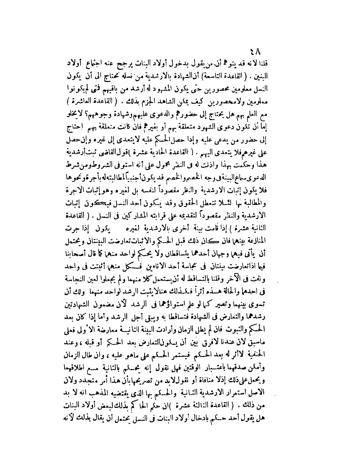 (الْقَاعِدَةُ الثَّالِثَةَ عَشْرَةَ) إنْ حَكَمَ الْحَاكِمُ بِذَلِكَ لِبَعْضِ أَوْلَادِ الْبَنَاتِ هَلْ يَقُولُ أَحَدٌ حَكَمَ بِإِدْخَالِ أَوْلَادِ الْبَنَاتِ فِي النَّسْلِ يَحْتَمِلُ أَنْ يُقَالَ بِذَلِكَ؛ لِأَنَّهُ