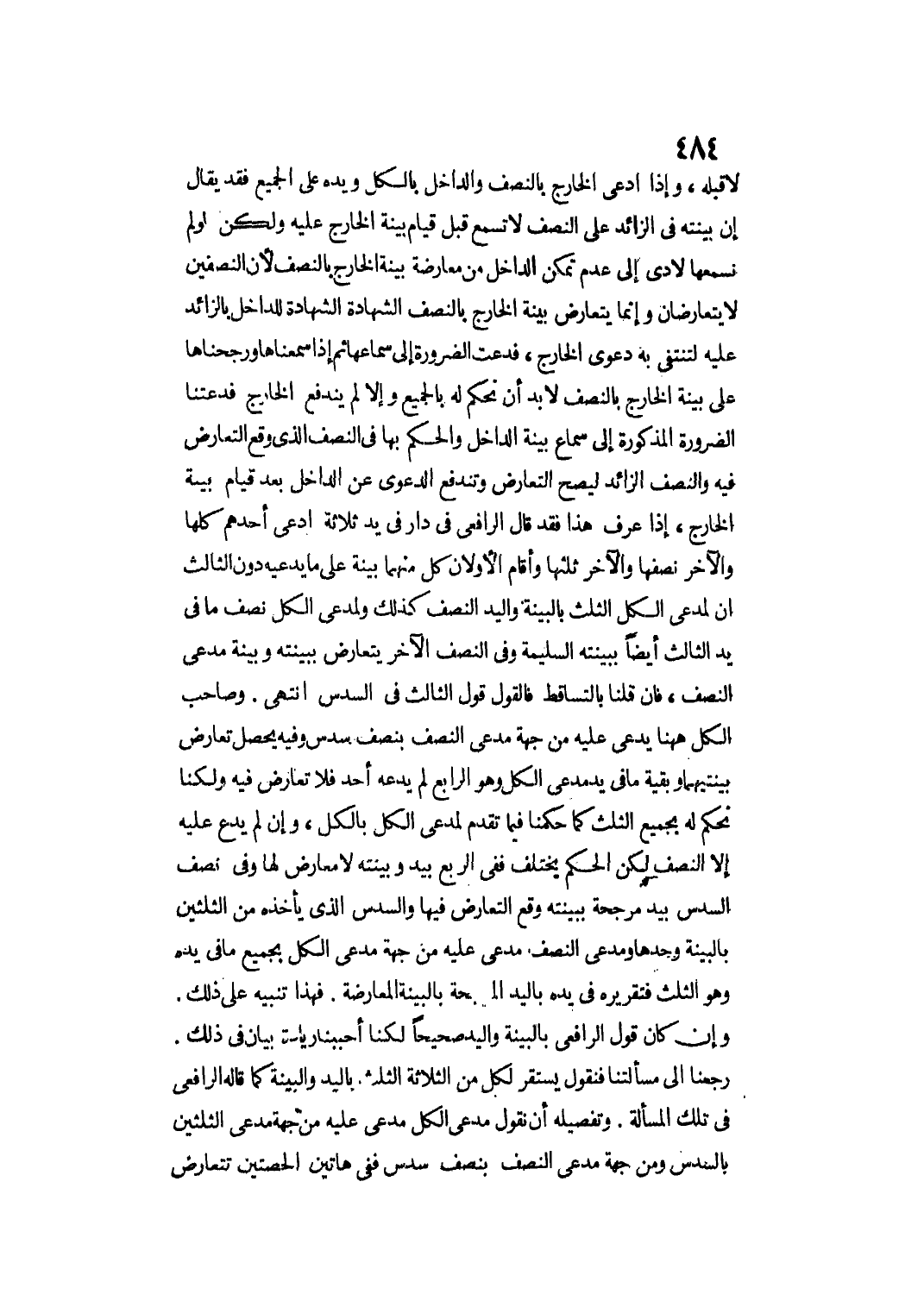 لَا قَبْلَهُ، وَإِذَا ادَّعَى الْخَارِجُ بِالنِّصْفِ وَالدَّاخِلُ بِالْكُلِّ وَيَدُهُ عَلَى الْجَمِيعِ فَقَدْ يُقَالُ: إنَّ بَيِّنَتَهُ فِي الزَّائِدِ عَلَى النِّصْفِ لَا تُسْمَعُ قَبْلَ قِيَامِ بَيِّنَةِ الْخَارِجِ عَلَيْهِ وَلَكِنْ لَوْ لَمْ نَسْمَعْهَا لَأَدَّى إلَى عَدَمِ تَمَكُّنِ الدَّاخِلِ مِنْ مُعَارَضَةِ بَيِّنَةِ الْخَارِجِ بِالنِّصْفِ؛ لِأَنَّ النِّصْفَيْنِ لَا يَتَعَارَضَانِ وَإِنَّمَا يَتَعَارَضُ بَيِّنَةُ الْخَارِجِ بِنِصْفِ الشَّهَادَةِ لِلدَّاخِلِ بِالزَّائِدِ عَلَيْهِ لِتَنْتَفِيَ بِهِ دَعْوَى الْخَارِجِ، فَدَعَتْ الضَّرُورَةُ إلَى سَمَاعِهَا.