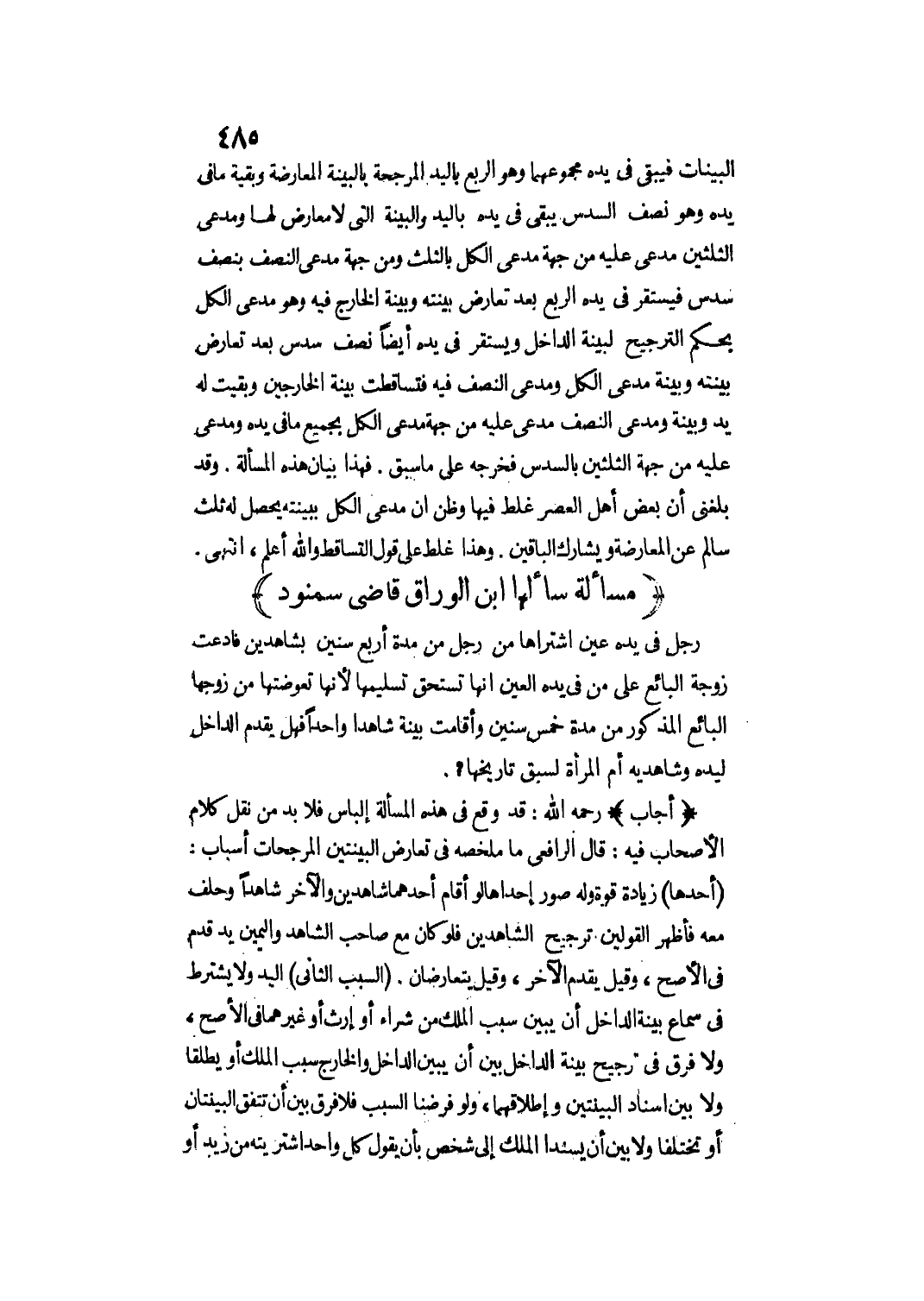 (مَسْأَلَةٌ سَأَلَهَا ابْنُ الْوَرَّاقِ قَاضِي سَمَنُّودَ) رَجُلٌ فِي يَدِهِ عَيْنٌ اشْتَرَاهَا مِنْ رَجُلٍ مِنْ مُدَّةِ أَرْبَعِ سِنِينَ بِشَاهِدَيْنِ فَادَّعَتْ زَوْجَةُ الْبَائِعِ عَلَى مَنْ فِي يَدِهِ الْعَيْنِ أَنَّهَا تَسْتَحِقُّ تَسْلِيمَهَا؛ لِأَنَّهَا تَعَوَّضَتْهَا مِنْ زَوْجِهَا الْبَائِعِ الْمَذْكُورِ مِنْ مُدَّةِ خَمْسِ سِنِينَ وَأَقَامَتْ بَيِّنَةً شَاهِدًا وَاحِدًا فَهَلْ يُقَدَّمُ الدَّاخِلُ لِيَدِهِ وَشَاهِدَيْهِ أَمْ الْمَرْأَةُ لِسَبْقِ تَارِيخِهَا؟ .