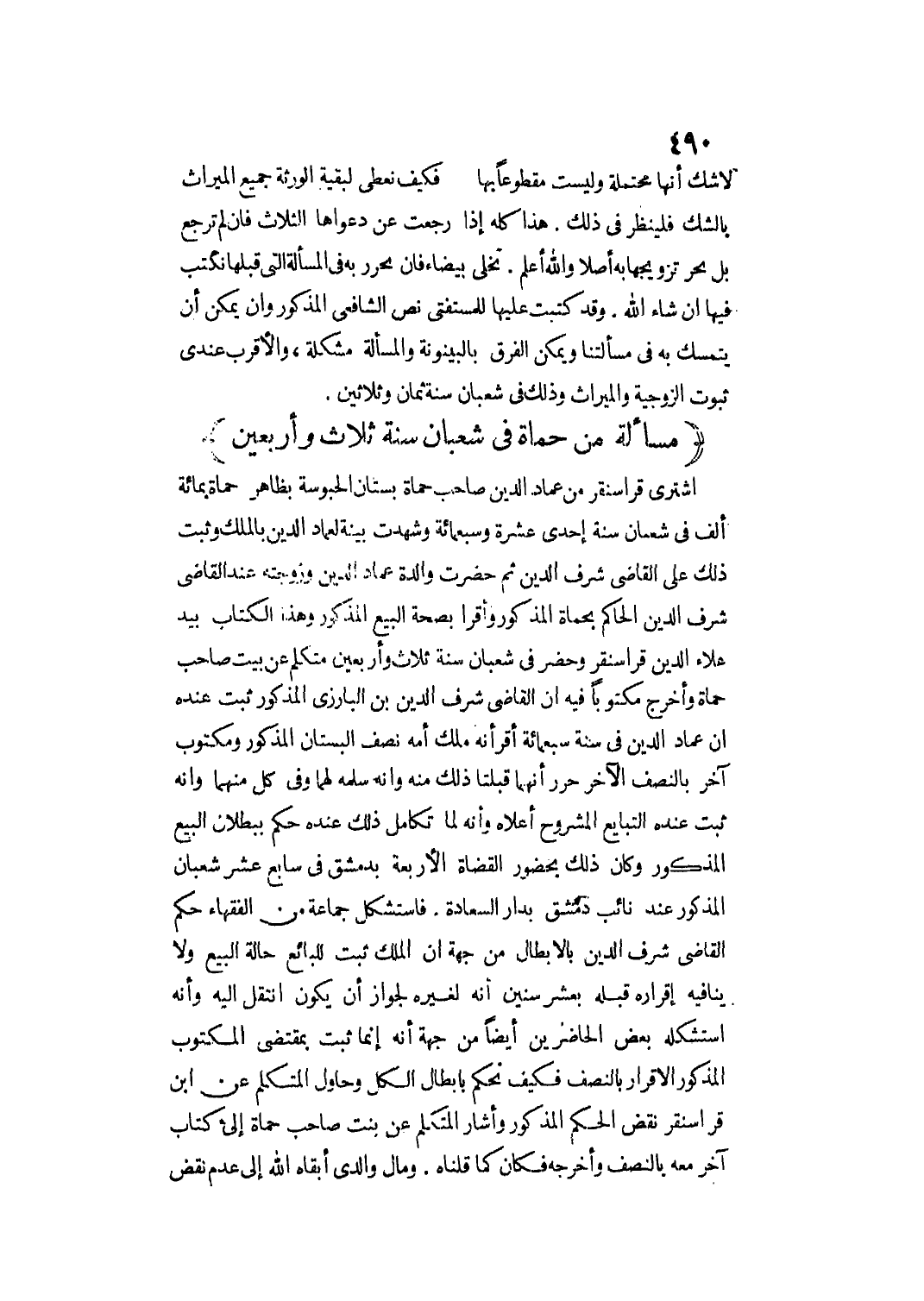 (مَسْأَلَةٌ مِنْ حُمَاةَ فِي شَعْبَانَ سَنَةَ ثَلَاثٍ وَأَرْبَعِينَ) اشْتَرَى قَرَاسُنْقُر مِنْ عِمَادِ الدِّينِ صَاحِبِ حُمَاةِ بُسْتَانِ الْحُبُوسَةِ بِظَاهِرِ حُمَاةٍ بِمِائَةِ أَلْفٍ فِي شَعْبَانَ سَنَةَ إحْدَى عَشْرَةَ وَسَبْعِمِائَةٍ وَشَهِدَتْ بَيِّنَةٌ لِعِمَادِ الدِّينِ بِالْمِلْكِ وَثَبَتَ ذَلِكَ عَلَى الْقَاضِي شَرَفِ الدِّينِ ثُمَّ حَضَرَتْ وَالِدَةُ عِمَادِ الدِّينِ وَزَوْجَتُهُ عِنْدَ الْقَاضِي شَرَفِ الدِّينِ الْحَاكِمِ بِحَمَاةِ الْمَذْكُورِ وَأَقَرَّا بِصِحَّةِ الْبَيْعِ الْمَذْكُورِ وَهَذَا الْكِتَابُ بِيَدِ عَلَاءِ الدِّينِ قَرَاسُنْقُر وَحَضَرَ فِي شَعْبَانَ سَنَةَ ثَلَاثٍ وَأَرْبَعِينَ مُتَكَلِّمٌ عَنْ بَيْتِ صَاحِبِ حُمَاةَ وَأَخْرَجَ مَكْتُوبًا فِيهِ أَنَّ الْقَاضِيَ شَرَفَ الدِّينِ بْنَ الْبَارِزِيِّ الْمَذْكُورَ ثَبَتَ عِنْدَهُ أَنَّ عِمَادَ الدِّينِ فِي سَنَةِ سَبْعِمِائَةٍ أَقَرَّ أَنَّهُ مَلَّكَ أُمَّهُ نِصْفَ الْبُسْتَانِ الْمَذْكُورِ وَمَكْتُوبًا آخَرَ بِالنِّصْفِ الْآخَرِ حَرَّرَ أَنَّهُمَا قَبِلَتَا ذَلِكَ مِنْهُ وَأَنَّهُ سَلَّمَهُ لَهُمَا وَفِي كُلٍّ مِنْهُمَا وَأَنَّهُ ثَبَتَ عِنْدَهُ التَّبَايُعَ الْمَشْرُوحَ أَعْلَاهُ وَأَنَّهُ لَمَّا تَكَامَلَ ذَلِكَ عِنْدَهُ حَكَمَ بِبُطْلَانِ الْبَيْعِ الْمَذْكُورِ وَكَانَ ذَلِكَ بِحُضُورِ الْقُضَاةِ الْأَرْبَعَةِ بِدِمَشْقَ فِي سَابِعَ عَشَرَ شَعْبَانَ الْمَذْكُورِ عِنْدَ نَائِبِ دِمَشْقَ بِدَارِ السَّعَادَةِ.