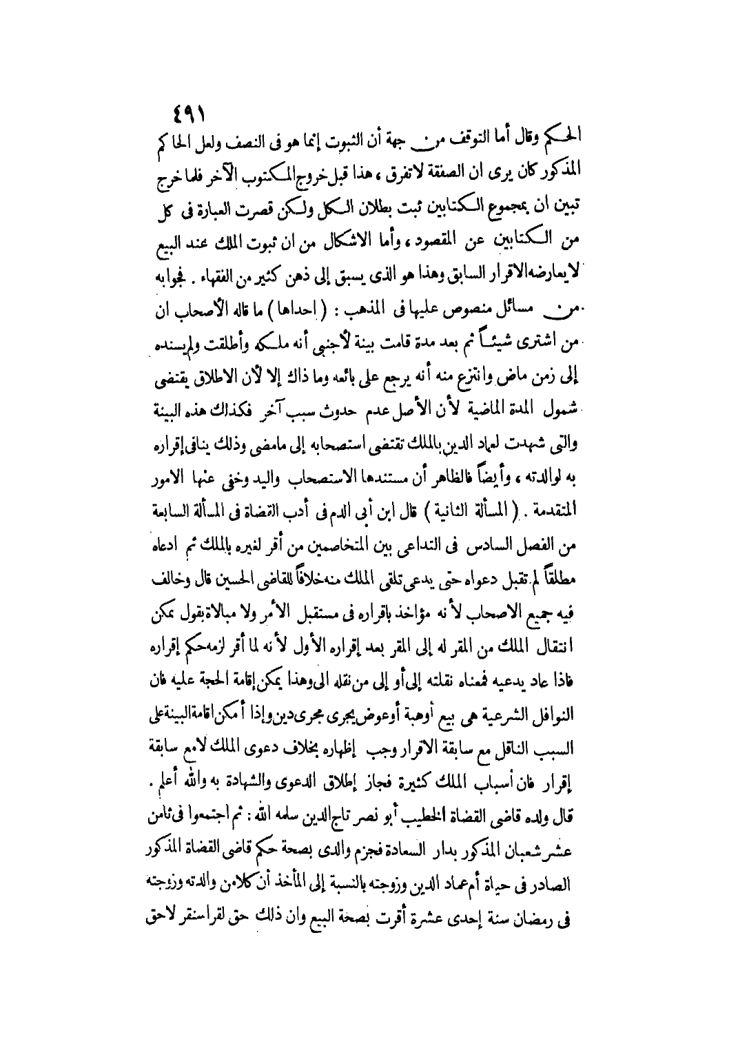 الْحُكْمِ وَقَالَ: أَمَّا التَّوَقُّفُ مِنْ جِهَةِ أَنَّ الثُّبُوتَ إنَّمَا هُوَ فِي النِّصْفِ وَلَعَلَّ الْحَاكِمَ الْمَذْكُورَ كَانَ يَرَى أَنَّ الصَّفْقَةَ لَا تُفَرِّقُ، هَذَا قَبْلَ خُرُوجِ الْمَكْتُوبِ الْآخَرِ فَلَمَّا خَرَجَ تَبَيَّنَّ أَنَّ بِمَجْمُوعِ الْكِتَابَيْنِ ثَبَتَ بُطْلَانُ الْكُلِّ وَلَكِنْ قَصُرَتْ الْعِبَارَةُ فِي كُلٍّ مِنْ الْكِتَابَيْنِ عَنْ الْمَقْصُودِ، وَأَمَّا الْإِشْكَالُ مِنْ أَنَّ ثُبُوتَ الْمِلْكِ عِنْدَ الْبَيْعِ لَا يُعَارِضُهُ الْإِقْرَارُ السَّابِقُ وَهَذَا هُوَ الَّذِي يَسْبِقُ إلَى ذِهْنِ كَثِيرٍ مِنْ الْفُقَهَاءِ.