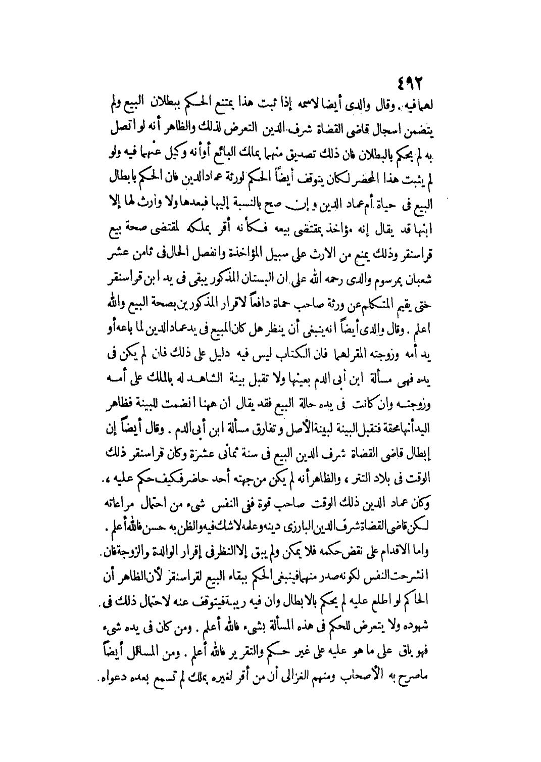 وَقَالَ وَالِدِي أَيْضًا لِاسْمِهِ إذَا ثَبَتَ هَذَا يَمْتَنِعُ الْحُكْمُ بِبُطْلَانِ الْبَيْعِ وَلَمْ يَتَضَمَّنْ إسْجَالَ قَاضِي الْقُضَاةِ شَرَفِ الدِّينِ التَّعَرُّضَ لِذَلِكَ وَالظَّاهِرُ أَنَّهُ لَوْ اتَّصَلَ بِهِ لَمْ يَحْكُمْ بِالْبُطْلَانِ فَإِنَّ ذَلِكَ تَصْدِيقٌ مِنْهُمَا بِمِلْكِ الْبَائِعِ أَوْ أَنَّهُ وَكِيلٌ عَنْهُمَا فِيهِ وَلَوْ لَمْ يَثْبُتْ هَذَا الْمَحْضَرُ لَكَانَ يَتَوَقَّفُ أَيْضًا الْحُكْمُ لِوَرَثَةِ عِمَادِ الدِّينِ فَإِنَّ الْحُكْمَ بِإِبْطَالِ الْبَيْعِ فِي حَيَاةِ أُمِّ عِمَادِ الدِّينِ وَإِنْ صَحَّ بِالنِّسْبَةِ إلَيْهَا فَبَعْدَهَا وَلَا وَارِثَ لَهَا إلَّا ابْنُهَا قَدْ يُقَالُ: إنَّهُ مُؤَاخَذٌ بِمُقْتَضَى بَيْعِهِ فَكَأَنَّهُ أَقَرَّ بِمِلْكِهِ لِمُقْتَضَى صِحَّةِ بَيْعِ قَرَاسُنْقُرَ وَذَلِكَ يَمْنَعُ مِنْ الْإِرْثِ عَلَى سَبِيلِ الْمُؤَاخَذَةِ وَانْفَصَلَ الْحَالُ فِي ثَامِنَ عَشْرَ شَعْبَانَ بِمَرْسُومِ وَالِدِي - رَحِمَهُ اللَّهُ - عَلَى أَنَّ الْبُسْتَانَ الْمَذْكُورَ يَبْقَى فِي يَدِ ابْنِ قَرَاسُنْقُرَ حَتَّى يُقِيمَ الْمُتَكَلِّمُ عَنْ وَرَثَةِ صَاحِبِ حُمَاةَ دَافِعًا لِإِقْرَارِ الْمَذْكُورِينَ بِصِحَّةِ الْبَيْعِ وَاَللَّهُ أَعْلَمُ.