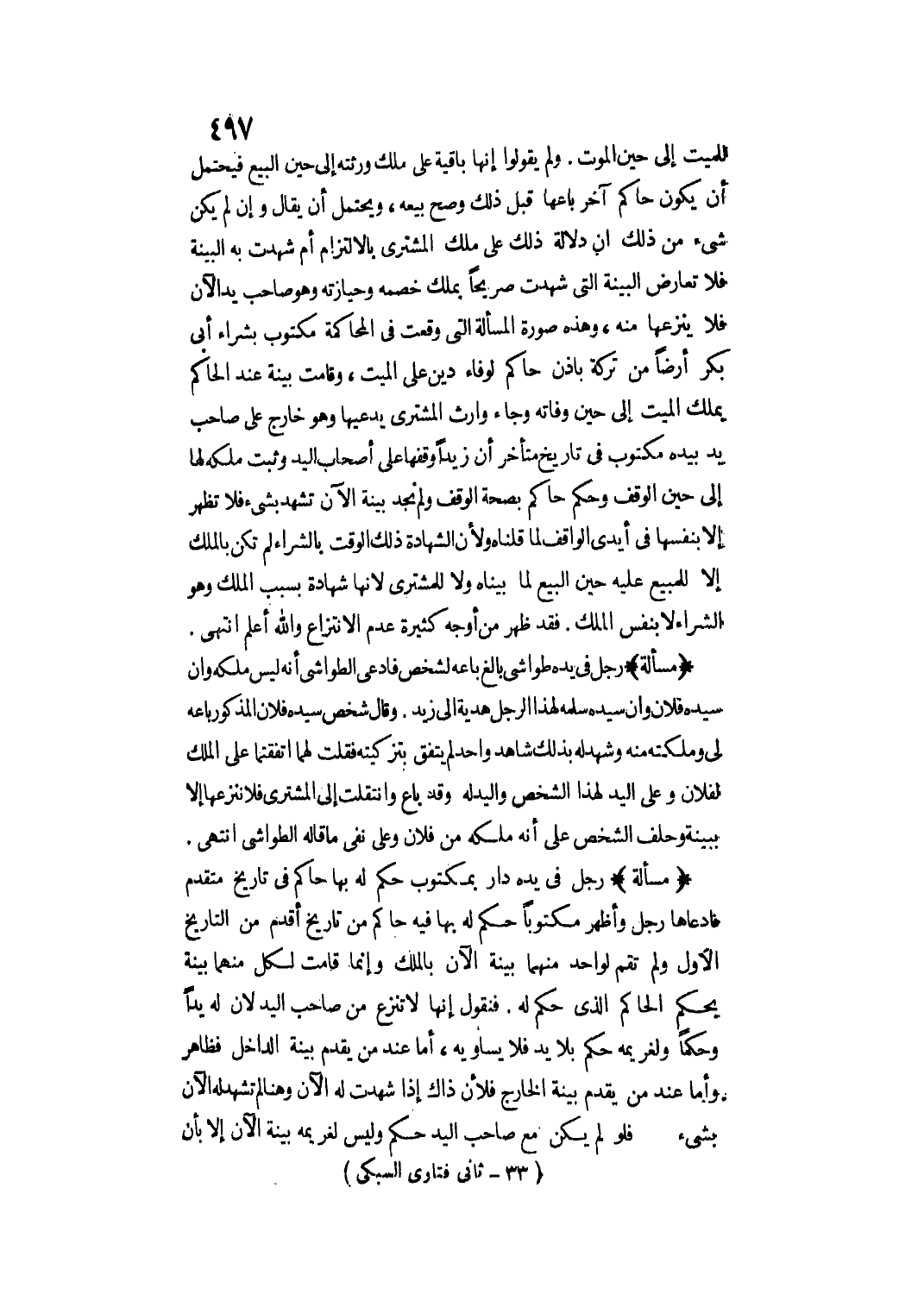 وَلَمْ يَقُولُوا: إنَّهَا بَاقِيَةٌ عَلَى مِلْكِ وَرَثَتِهِ إلَى حِينِ الْبَيْعِ فَيَحْتَمِلُ أَنْ يَكُونَ حَاكِمٌ آخَرُ بَاعَهَا قَبْلَ ذَلِكَ وَصَحَّ بَيْعُهُ، وَيَحْتَمِلُ أَنْ يُقَالَ وَإِنْ لَمْ يَكُنْ شَيْءٌ مِنْ ذَلِكَ أَنَّ دَلَالَةَ ذَلِكَ عَلَى مِلْكِ الْمُشْتَرِي بِالِالْتِزَامِ أَمْ شَهِدَتْ بِهِ الْبَيِّنَةُ فَلَا تُعَارَضُ الْبَيِّنَةُ الَّتِي شَهِدَتْ صَرِيحًا بِمِلْكِ خَصْمِهِ وَحِيَازَتِهِ وَهُوَ صَاحِبُ يَدٍ الْآنَ فَلَا يَنْزِعُهَا مِنْهُ، وَهَذِهِ صُورَةُ الْمَسْأَلَةِ الَّتِي وَقَعَتْ فِي الْمُحَاكَمَةِ مَكْتُوبٌ بِشِرَاءِ أَبِي بَكْرٍ أَرْضًا مِنْ تَرِكَةٍ بِإِذْنِ حَاكِمٍ لِوَفَاءِ دَيْنٍ عَلَى الْمَيِّتِ، وَقَامَتْ بَيِّنَةٌ عِنْدَ الْحَاكِمِ بِمِلْكِ الْمَيِّتِ إلَى حِينِ وَفَاتِهِ وَجَاءَ وَارِثُ الْمُشْتَرِي يَدَّعِيهَا وَهُوَ خَارِجٌ عَلَى صَاحِبِ يَدٍ بِيَدِهِ مَكْتُوبٌ فِي تَارِيخٍ مُتَأَخِّرٍ أَنَّ زَيْدًا وَقَفَهَا عَلَى أَصْحَابِ الْيَدِ وَثَبَتَ مِلْكُهُ لَهَا إلَى حِينِ الْوَقْفِ وَحَكَمَ حَاكِمٌ بِصِحَّةِ الْوَقْفِ وَلَمْ نَجِدْ بَيِّنَةً الْآنَ تَشْهَدُ بِشَيْءٍ فَلَا تَظْهَرُ إلَّا بِنَفْسِهَا فِي أَيْدِي الْوَاقِفِ لِمَا قُلْنَاهُ وَلِأَنَّ الشَّهَادَةَ ذَلِكَ الْوَقْتَ بِالشِّرَاءِ لَمْ تَكُنْ بِالْمِلْكِ إلَّا لِلْمَبِيعِ عَلَيْهِ حِينَ الْبَيْعِ لِمَا بَيَّنَاهُ وَلَا لِلْمُشْتَرِي؛ لِأَنَّهَا شَهَادَةٌ بِسَبَبِ الْمِلْكِ وَهُوَ الشِّرَاءُ لَا بِنَفْسِ الْمِلْكِ.