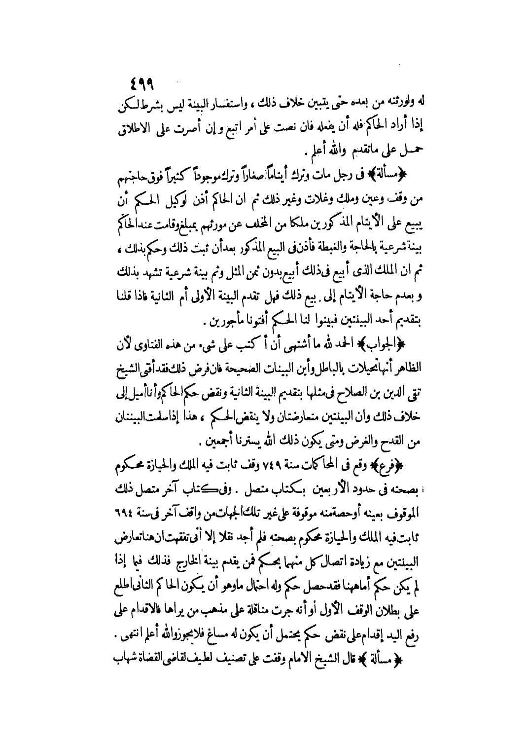(الْجَوَابُ) الْحَمْدُ لِلَّهِ مَا أَشْتَهِي أَنْ أَكْتُبَ عَلَى شَيْءٍ مِنْ هَذِهِ الْفَتَاوَى؛ لِأَنَّ الظَّاهِرَ أَنَّهَا تَحَيُّلَاتٌ بِالْبَاطِلِ وَأَيْنَ الْبَيِّنَاتُ الصَّحِيحَةُ فَإِنْ فَرَضَ ذَلِكَ فَقَدْ أَفْتَى الشَّيْخُ تَقِيُّ الدِّينِ بْنُ الصَّلَاحِ فِي مِثْلِهَا بِتَقْدِيمِ الْبَيِّنَةِ الثَّانِيَةِ وَنَقْضِ حُكْمِ الْحَاكِمِ وَأَنَا أَمِيلُ إلَى خِلَافِ ذَلِكَ وَأَنَّ الْبَيِّنَتَيْنِ مُتَعَارِضَتَانِ وَلَا يُنْقَضُ الْحُكْمُ، هَذَا إذَا سَلِمَتْ الْبَيِّنَتَانِ مِنْ الْقَدْحِ وَالْغَرَضِ وَمَتَى يَكُونُ ذَلِكَ اللَّهُ يَسْتُرُنَا أَجْمَعِينَ.