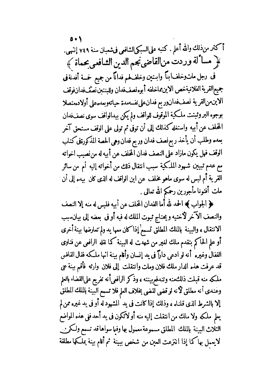 (مَسْأَلَةٌ وَرَدَتْ مِنْ الْقَاضِي نَجْمِ الدِّينِ الشَّافِعِيِّ بِحَمَاةِ)