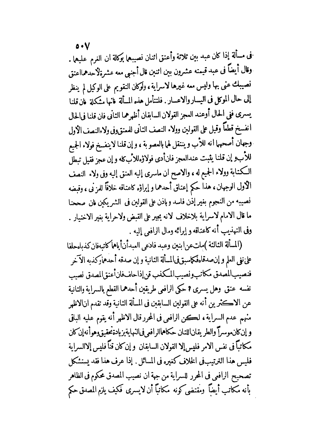(الْمَسْأَلَةُ الثَّالِثَةُ) مَاتَ عَنْ ابْنَيْنِ وَعَبْدٍ فَادَّعَى الْعَبْدُ أَنَّ أَبَاهُمَا كَاتَبَهُ فَإِنْ كَذَّبَاهُ حَلَفَا عَلَى نَفْيِ الْعِلْمِ وَإِنْ صَدَّقَاهُ فَكَمَا سَبَقَ فِي الْمَسْأَلَةِ الثَّانِيَةِ وَإِنْ صَدَّقَهُ أَحَدُهُمَا وَكَذَّبَهُ الْآخَرُ فَنَصِيبُ الْمُصَدِّقِ مُكَاتَبٌ وَنَصِيبُ الْمُكَذِّبِ قِنٌّ إذَا حَلَفَ فَإِنْ أَعْتَقَ الْمُصَدِّقُ نَصِيبَ نَفْسِهِ عَتَقَ وَهَلْ يَسْرِي؟ حَكَى الرَّافِعِيُّ طَرِيقَيْنِ أَحَدُهُمَا الْقَطْعُ بِالسِّرَايَةِ وَالثَّانِيَةُ عَنْ الْأَكْثَرِينَ أَنَّهُ عَلَى الْقَوْلَيْنِ السَّابِقَيْنِ فِي الْمَسْأَلَةِ الثَّانِيَةِ وَقَدْ تَقَدَّمَ أَنَّ الْأَظْهَرَ مِنْهُمْ عَدَمُ السِّرَايَةِ، لَكِنَّ الرَّافِعِيُّ فِي الْمُحَرَّرِ قَالَ الْأَظْهَرُ أَنَّهُ يُقَوَّمُ عَلَيْهِ الْبَاقِي وَإِنْ كَانَ مُوسِرًا وَالطَّرِيقَانِ اللَّتَانِ حَكَاهُمَا الرَّافِعِيُّ فِي النِّهَايَةِ بِزِيَادَةِ تَحْقِيقٍ وَهُوَ أَنَّهُ إنْ كَانَ مُكَاتَبًا فِي نَفْسِ الْأَمْرِ فَلَيْسَ إلَّا الْقَوْلَانِ السَّابِقَانِ وَإِنْ كَانَ قِنًّا فَلَيْسَ إلَّا السِّرَايَةُ فَلَيْسَ هَذَا التَّرْتِيبُ فِي الْخِلَافِ كَغَيْرِهِ فِي الْمَسَائِلِ.
