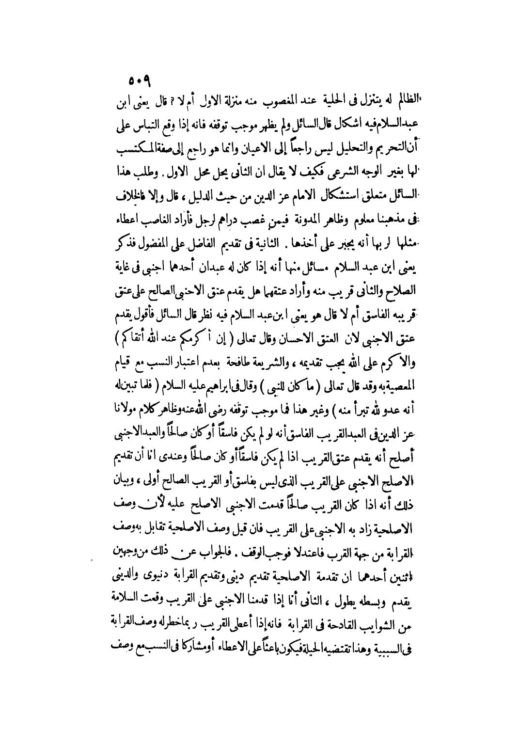 الثَّانِيَةُ فِي تَقْدِيمِ الْفَاضِلِ عَلَى الْمَفْضُولِ فَذَكَرَ يَعْنِي ابْنَ عَبْدِ السَّلَامِ مَسَائِلَ مِنْهَا أَنَّهُ إذَا كَانَ لَهُ عَبْدَانِ أَحَدُهُمَا أَجْنَبِيٌّ فِي غَايَةِ الصَّلَاحِ وَالثَّانِي قَرِيبٌ مِنْهُ وَأَرَادَ عِتْقَهُمَا هَلْ يُقَدَّمُ عِتْقُ الْأَجْنَبِيِّ الصَّالِحِ عَلَى عِتْقِ قَرِيبِهِ الْفَاسِقِ أَمْ لَا؟ قَالَ هُوَ يَعْنِي ابْنَ عَبْدِ السَّلَامِ فِيهِ نَظَرٌ، قَالَ السَّائِلُ: فَأَقُولُ يُقَدِّمُ عِتْقَ الْأَجْنَبِيِّ؛ لِأَنَّ الْعِتْقَ الْإِحْسَانُ وَقَالَ تَعَالَى {إِنَّ أَكْرَمَكُمْ عِنْدَ اللَّهِ أَتْقَاكُمْ} [الحجرات: 13] وَالْأَكْرَمُ عَلَى اللَّهِ يَجِبُ تَقْدِيمُهُ، وَالشَّرِيعَةُ طَافِحَةٌ بِعَدَمِ اعْتِبَارِ النَّسَبِ مَعَ قِيَامِ الْمَعْصِيَةِ بِهِ وَقَدْ قَالَ تَعَالَى {مَا كَانَ لِلنَّبِيِّ} [التوبة: 113] وَقَالَ فِي إبْرَاهِيمَ - عَلَيْهِ السَّلَامُ - {فَلَمَّا تَبَيَّنَ لَهُ أَنَّهُ عَدُوٌّ لِلَّهِ تَبَرَّأَ مِنْهُ} [التوبة: 114] وَغَيْرُ هَذَا فَمَا مُوجِبُ تَوَقُّفِهِ - رَضِيَ اللَّهُ عَنْهُ - وَظَاهِرُ كَلَامِ مَوْلَانَا عِزِّ الدِّينِ فِي الْعَبْدِ الْقَرِيبِ أَنَّهُ لَوْ لَمْ يَكُنْ فَاسِقًا أَوْ كَانَ صَالِحًا وَالْعَبْدُ الْأَجْنَبِيُّ أَصْلَحُ أَنَّهُ يُقَدِّمُ عِتْقَ الْقَرِيبِ إذَا لَمْ يَكُنْ فَاسِقًا أَوْ كَانَ صَالِحًا، وَعِنْدِي أَنَا أَنَّ تَقْدِيمَ الْأَصْلَحِ الْأَجْنَبِيُّ عَلَى الْقَرِيبِ الَّذِي لَيْسَ بِفَاسِقٍ أَوْ الْقَرِيبُ الصَّالِحُ أَوْلَى، وَبَيَانُ ذَلِكَ أَنَّهُ إذَا كَانَ الْقَرِيبُ صَالِحًا قَدَّمْت الْأَجْنَبِيَّ الْأَصْلَحَ عَلَيْهِ؛ لِأَنَّ وَصْفَ الْأَصْلَحِيَّةِ زَادَ بِهِ الْأَجْنَبِيُّ عَلَى الْقَرِيبِ فَإِنْ قِيلَ: وَصْفُ الْأَصْلَحِيَّةِ تَقَابَلَ بِهِ وَصْفُ الْقَرَابَةِ مِنْ جِهَةِ الْقُرْبِ فَاعْتَدَلَا فَوَجَبَ الْوَقْفُ.