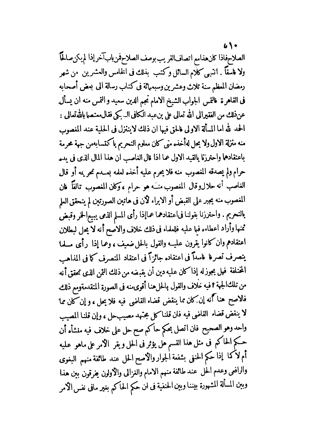 انْتَهَى كَلَامُ السَّائِلِ وَكُتِبَ بِذَلِكَ فِي الْخَامِسِ وَالْعِشْرِينَ مِنْ شَهْرِ رَمَضَانَ الْمُعَظَّمِ سَنَةَ ثَلَاثٍ وَعِشْرِينَ وَسَبْعِمِائَةٍ فِي كِتَابِ رِسَالَةٍ إلَى بَعْضِ أَصْحَابِهِ فِي الْقَاهِرَةِ فَالْتَمَسَ الْجَوَابَ الشَّيْخُ الْإِمَامُ نَجْمُ الدِّينِ سَعِيدٌ وَالْتَمَسَ مِنْهُ أَنْ يَسْأَلَ عَنْ ذَلِكَ مِنْ الْفَقِيرِ إلَى اللَّهِ تَعَالَى عَلِيِّ بْنِ عَبْدِ الْكَافِي السُّبْكِيّ فَقَالَ مُعْتَصِمًا بِاَللَّهِ تَعَالَى: الْحَمْدُ لِلَّهِ أَمَّا الْمَسْأَلَةُ الْأُولَى فَالْحَقُّ فِيهَا أَنَّ ذَلِكَ لَا يَتَنَزَّلُ فِي الْحِلْيَةِ عِنْدَ الْمَغْصُوبِ مِنْهُ مَنْزِلَةَ الْأَوَّلِ وَلَا يَحِلُّ لَهُ أَخْذُهُ مَتَى كَانَ مَعْلُومَ التَّحْرِيمِ بِاكْتِسَابِهِ مِنْ جِهَةٍ مُحَرَّمَةٍ بِاعْتِقَادِهِمَا وَاحْتَرَزْنَا بِالْقَيْدِ الْأَوَّلِ عَمَّا إذَا قَالَ الْغَاصِبُ: إنَّ هَذَا الْمَالَ الَّذِي فِي يَدِهِ حَرَامٌ وَلَمْ يُصَدِّقْهُ الْمَغْصُوبُ مِنْهُ فَلَا يَحْرُمُ عَلَيْهِ أَخْذُهُ لِعِلْمِهِ بِعَدَمِ تَحْرِيمِهِ أَوْ قَالَ الْغَاصِبُ: إنَّهُ حَلَالٌ وَقَالَ الْمَغْصُوبُ مِنْهُ: هُوَ حَرَامٌ، وَكَانَ الْمَغْصُوبُ تَالِفًا فَإِنَّ الْمَغْصُوبَ مِنْهُ يُجْبَرُ عَلَى الْقَبْضِ أَوْ الْإِبْرَاءِ؛ لِأَنَّ فِي هَاتَيْنِ الصُّورَتَيْنِ لَمْ يَتَحَقَّقْ الْعِلْمُ بِالتَّحْرِيمِ.