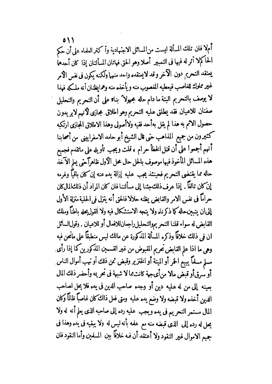 أَمْ لَا فَإِنَّ تِلْكَ الْمَسْأَلَةَ لَيْسَتْ مِنْ الْمَسَائِلِ الِاجْتِهَادِيَّةِ وَأَكْثَرُ الْعُلَمَاءِ عَلَى أَنَّ حُكْمَ الْحَاكِمِ لَا أَثَرَ لَهُ فِيهَا فِي التَّعْبِيرِ أَصْلًا وَهُوَ الْحَقُّ فَهَاتَانِ الْمَسْأَلَتَانِ إذَا كَانَ أَحَدُهُمَا يَعْتَقِدُ التَّحْرِيمَ دُونَ الْآخَرِ وَقَدْ لَا يَعْتَقِدُهُ وَاحِدٌ مِنْهُمَا وَلَكِنَّهُ يَكُونُ فِي نَفْسِ الْأَمْرِ غَيْرُ مَمْلُوكٍ لِلْغَاصِبِ فَيُعْطِيهِ الْمَغْصُوبُ مِنْهُ وَيَأْخُذُهُ مِنْهُ وَهُمَا يَظُنَّانِ أَنَّهُ مِلْكُهُ فَهَذَا لَا يُوصَفُ بِالتَّحْرِيمِ أَلْبَتَّةَ مَا دَامَ حَالُهُ مَجْهُولًا بِنَاءً عَلَى أَنَّ التَّحْرِيمَ وَالتَّحْلِيلَ صِفَتَانِ لِلْأَعْيَانِ فَقَدْ يُطْلَقُ عَلَيْهِ التَّحْرِيمُ وَهُوَ إطْلَاقٌ مَجَازِيٌّ؛ لِأَنَّهُمْ لَا يُرِيدُونَ حُصُولَ الْإِثْمِ بِهِ هَذَا لَمْ يَقُلْ بِهِ أَحَدٌ فَقِيهٌ وَلَا أُصُولِيٌّ وَهَذَا الْإِطْلَاقُ الْمَجَازِيُّ ارْتَكَبَهُ كَثِيرُونَ مِنْ جَمِيعِ الْمَذَاهِبِ حَتَّى قَالَ الشَّيْخُ أَبُو حَامِدٍ الْإسْفَرايِينِيّ مِنْ أَصْحَابِنَا أَنَّهُمْ أَجْمَعُوا عَلَى أَنَّ قَتْلَ الْخَطَأِ حَرَامٌ قُلْت: وَيَجِبُ تَأْوِيلُهُ عَلَى مَا تَقَدَّمَ فَجَمِيعُ هَذِهِ الْمَسَائِلِ الْمَأْخُوذُ فِيهَا مَوْصُوفٌ بِالْحِلِّ حَالٌّ مَحَلَّ الْأَوَّلِ ظَاهِرًا حَتَّى يَعْلَمَ الْآخِذُ مِمَّا يَقْتَضِي التَّحْرِيمَ فَحِينَئِذٍ يَجِبُ عَلَيْهِ إزَالَةُ يَدِهِ عَنْهُ إنْ كَانَ بَاقِيًا وَغُرْمُهُ إنْ كَانَ تَالِفًا.
