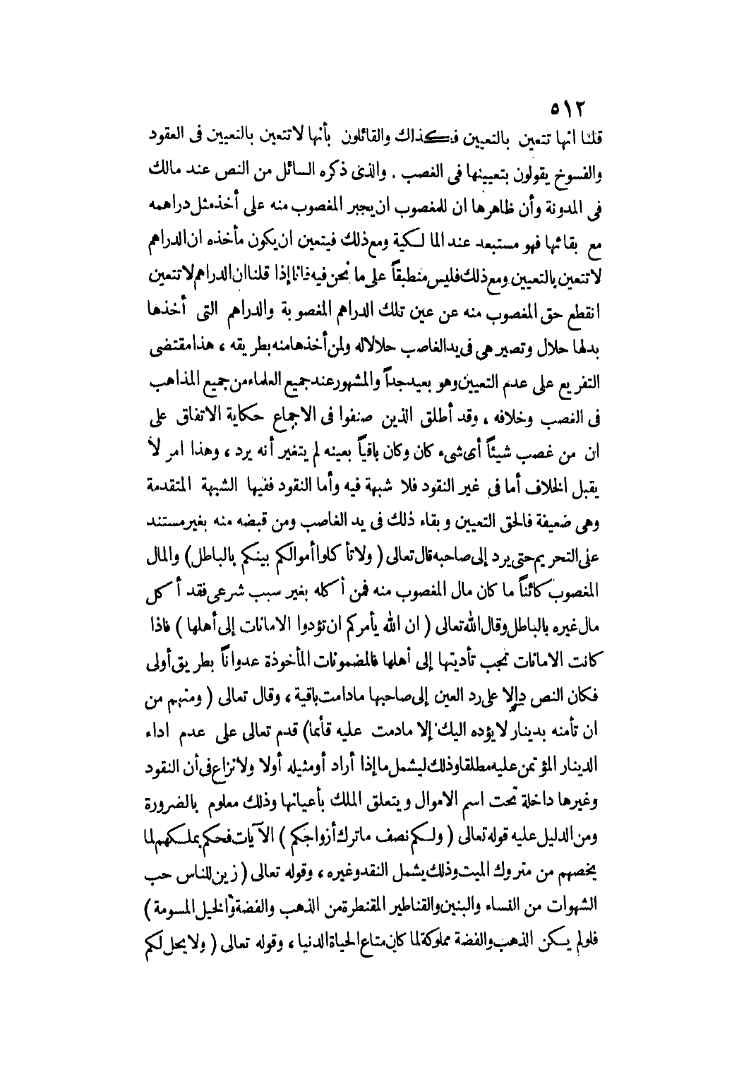 وَقَالَ تَعَالَى {وَمِنْهُمْ مَنْ إِنْ تَأْمَنْهُ بِدِينَارٍ لا يُؤَدِّهِ إِلَيْكَ إِلا مَا دُمْتَ عَلَيْهِ قَائِمًا} [آل عمران: 75] قَدَّمَ تَعَالَى عَلَى عَدَمِ أَدَاءِ الدِّينَارِ الْمُؤْتَمَنِ عَلَيْهِ مُطْلَقًا وَذَلِكَ لِيَشْمَلَ مَا إذَا أَرَادَ أَوْ مَثِيلَهُ أَوْ لَا وَلَا نِزَاعَ فِي أَنَّ النُّقُودَ وَغَيْرَهَا دَاخِلَةٌ تَحْتَ اسْمِ الْأَمْوَالِ وَيَتَعَلَّقُ الْمِلْكُ بِأَعْيَانِهَا وَذَلِكَ مَعْلُومٌ بِالضَّرُورَةِ وَمِنْ الدَّلِيلِ عَلَيْهِ قَوْله تَعَالَى {وَلَكُمْ نِصْفُ مَا تَرَكَ أَزْوَاجُكُمْ} [النساء: 12] الْآيَاتِ، فَحَكَمَ بِمِلْكِهِمْ لِمَا يَخُصُّهُمْ مِنْ مَتْرُوكِ الْمَيِّتِ وَذَلِكَ يَشْمَلُ النَّقْدَ وَغَيْرَهُ وقَوْله تَعَالَى {زُيِّنَ لِلنَّاسِ حُبُّ الشَّهَوَاتِ مِنَ النِّسَاءِ وَالْبَنِينَ وَالْقَنَاطِيرِ الْمُقَنْطَرَةِ مِنَ الذَّهَبِ وَالْفِضَّةِ وَالْخَيْلِ الْمُسَوَّمَةِ} [آل عمران: 14] فَلَوْ لَمْ يَكُنْ الذَّهَبُ وَالْفِضَّةُ مَمْلُوكَةً لَمَا كَانَ مَتَاعُ الْحَيَاةِ الدُّنْيَا