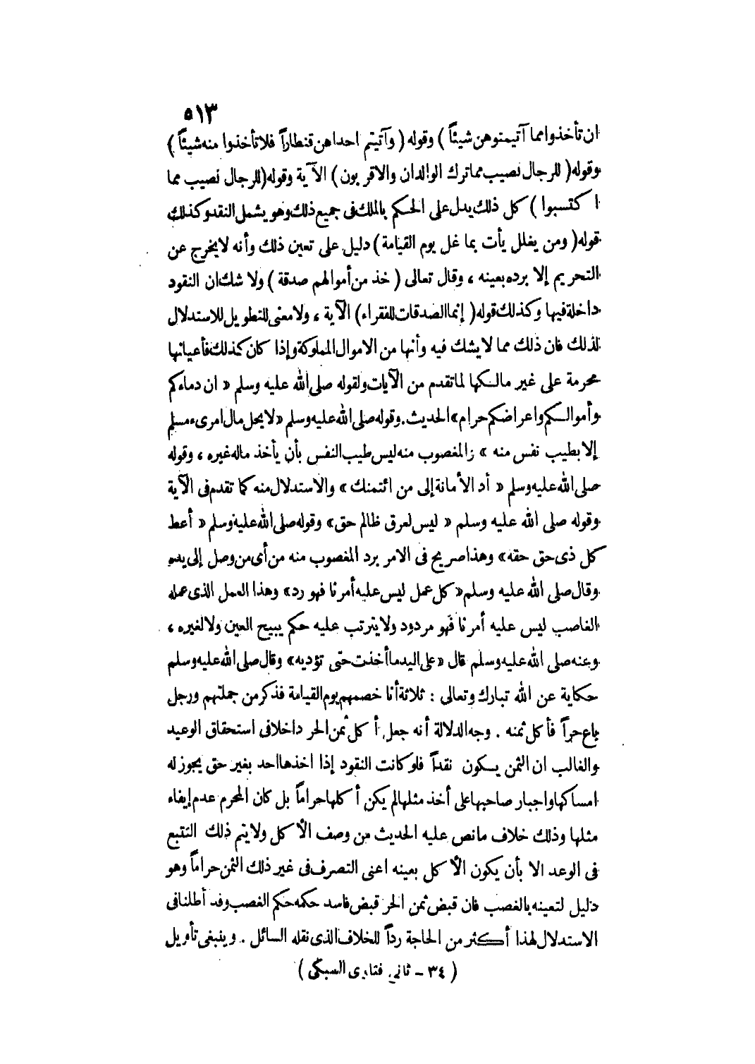 وَقَوْلُهُ {وَآتَيْتُمْ إِحْدَاهُنَّ قِنْطَارًا فَلا تَأْخُذُوا مِنْهُ شَيْئًا} [النساء: 20] ، وَقَوْلُهُ {لِلرِّجَالِ نَصِيبٌ مِمَّا تَرَكَ الْوَالِدَانِ وَالأَقْرَبُونَ} [النساء: 7] الْآيَةَ وَقَوْلُهُ {لِلرِّجَالِ نَصِيبٌ مِمَّا اكْتَسَبُوا} [النساء: 32] كُلُّ ذَلِكَ يَدُلُّ عَلَى الْحُكْمِ بِالْمِلْكِ فِي جَمِيعِ ذَلِكَ وَهُوَ يَشْمَلُ النَّقْدَ وَكَذَلِكَ قَوْلُهُ {وَمَنْ يَغْلُلْ يَأْتِ بِمَا غَلَّ يَوْمَ الْقِيَامَةِ} [آل عمران: 161] دَلِيلٌ عَلَى تَعَيُّنِ ذَلِكَ وَأَنَّهُ لَا يَخْرُجُ عَنْ التَّحْرِيمِ إلَّا بِرَدِّهِ بِعَيْنِهِ.