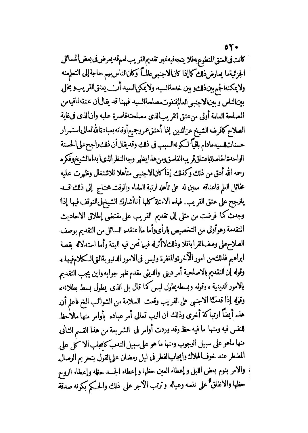 كَانَتْ فِي الْعِتْقِ الْمُتَطَوَّعِ بِهِ فَلَا يَتَّجِهُ فِيهِ غَيْرُ تَقْدِيمِ الْقَرِيبِ نَعَمْ قَدْ يَعْرِضُ فِي بَعْضِ الْمَسَائِلِ الْجُزْئِيَّةِ مَا يُعَارِضُ ذَلِكَ كَمَا إذَا كَانَ الْأَجْنَبِيُّ عَالِمًا وَكَانَ النَّاسُ بِهِمْ حَاجَةٌ إلَى التَّعَلُّمِ مِنْهُ وَلَا يُمْكِنُهُ الْجَمْعُ بَيْنَ ذَلِكَ وَبَيْنَ خِدْمَةِ السَّيِّدِ وَلَا يُمْكِنُ السَّيِّدُ أَنْ يَعْتِقَ الْقَرِيبَ وَيُخَلِّيَ بَيْنَ النَّاسِ وَبَيْنَ الْأَجْنَبِيِّ الْعَالِمِ فَنُفَوِّتُ مَصْلَحَةً لِلسَّيِّدِ فَهَاهُنَا قَدْ يُقَالُ: إنَّ عِتْقَهُ لِمَا فِيهِ مِنْ الْمَصْلَحَةِ الْعَامَّةِ أَوْلَى مِنْ عِتْقِ الْقَرِيبِ الَّذِي مَصْلَحَتُهُ قَاصِرَةٌ عَلَيْهِ وَإِنَّ الَّذِي فِي غَايَةِ الصَّلَاحِ كَمَا فَرَضَهُ الشَّيْخُ عِزُّ الدِّينِ إذَا أَعْتَقَ عَمْرٌو جَمِيعَ أَوْقَاتِهِ بِعِبَادَةِ اللَّهِ تَعَالَى اسْتِمْرَارُ حَسَنَاتٍ لِلسَّيِّدِ مَا دَامَ بَاقِيًا لِكَوْنِهِ السَّبَبَ فِي ذَلِكَ.